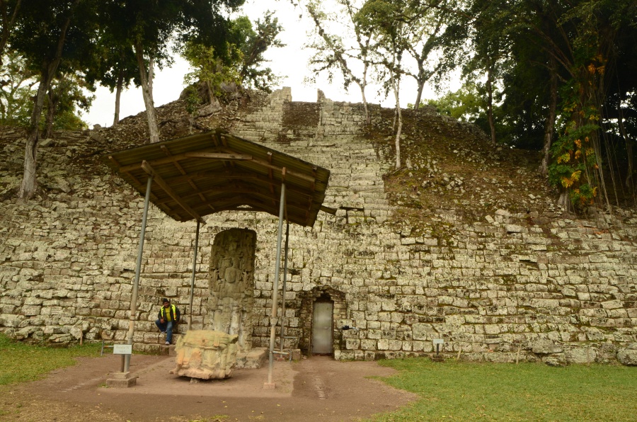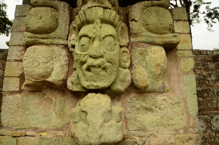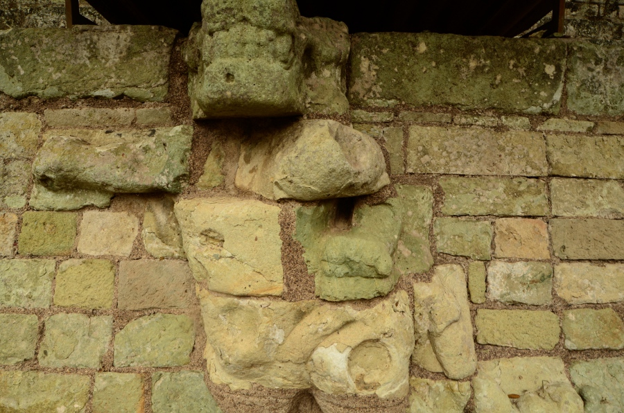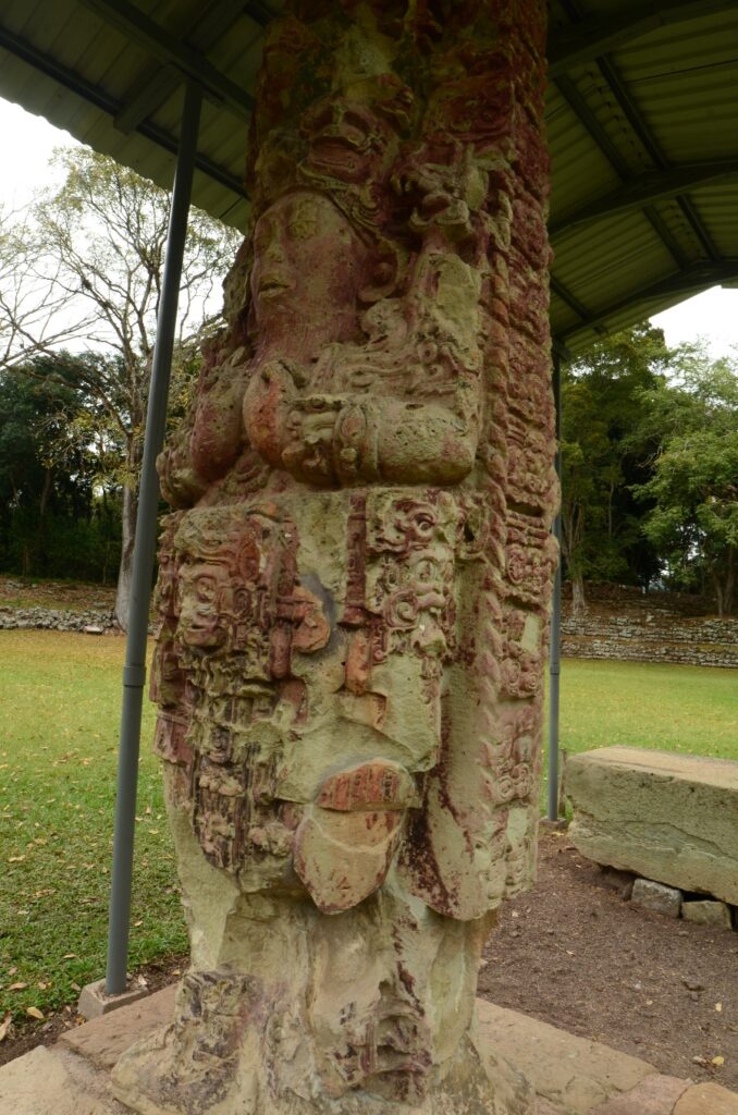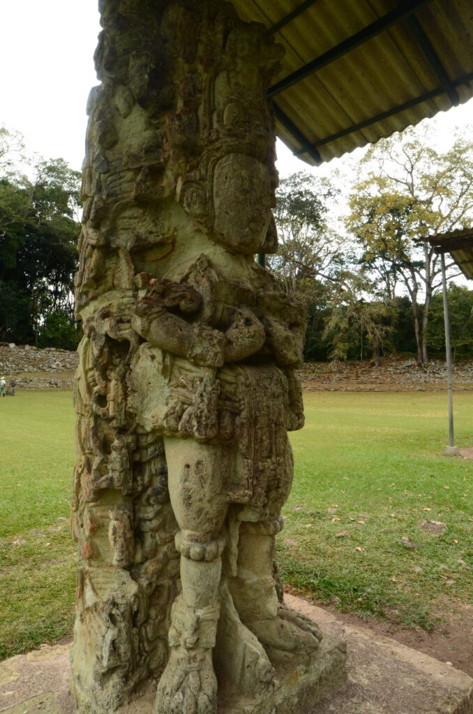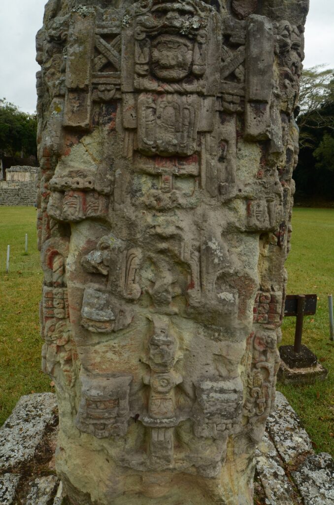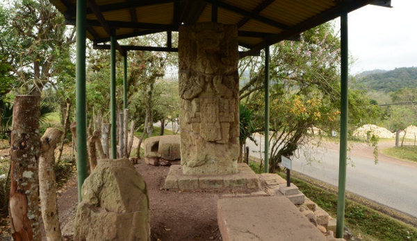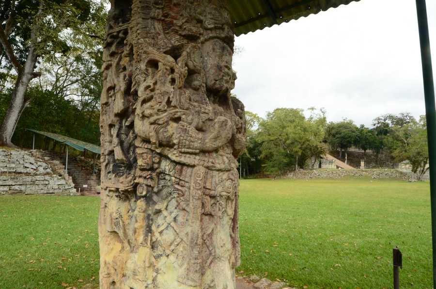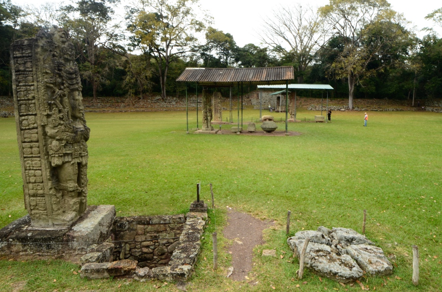 Son climat chaud et sec, au contraire de l’humidité du Chiapas et du Guatemala, a permis de conserver les stèles et de les préserver de l’érosion. Un comble, ma journée à Copán sera la seule où il fera gris et humide… Pas de chance ! Qu’importe, la ronde des stèles commence même avant que de rentrer officiellement sur le site. Sur le chemin pierré qui mène à l’entrée, on est arrêté par une première stèle monumentale : la stèle numéro 5.
