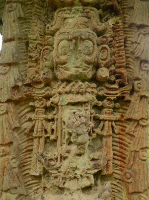 À deux pas de là se dresse la fameuse stèle B. Fameuse, car elle fut longtemps l’objet de controverses. Sa tiare paraît en effet ornée de chaque côté d’une trompe d’éléphant ! Mais il n’en est rien, en fait. bien y regarder de plus près, ce sont des becs de perroquets. Le roi incarne ici le dieu Chac sortant de la gueule d’un monstre.