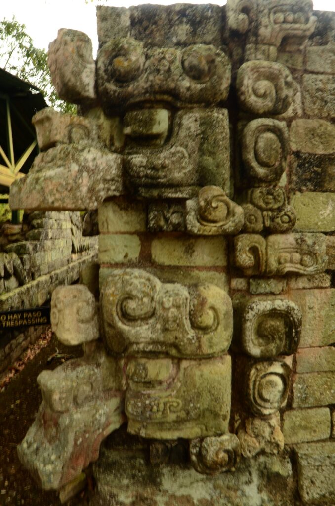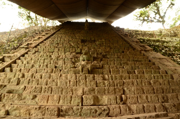 On peut considérer cet escalier comme un grand livre de l’histoire de Copán et de la dynastie des rois qui l’ont gouvernée. Pour la petite histoire, seules les 15 premières marches sont d’origine, posées sur une gueule de serpent à l’envers… La partie supérieure, autrefois écroulée… a été reconstituée dans le désordre !
