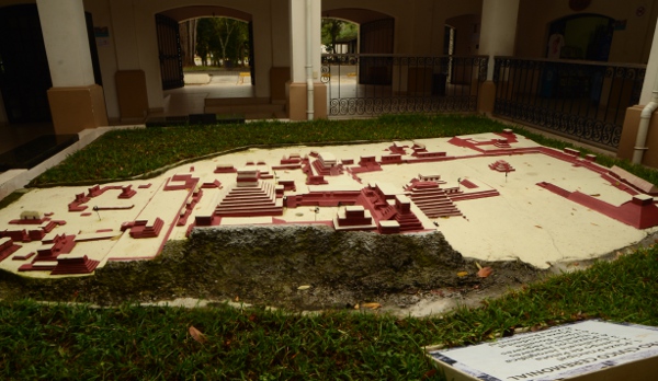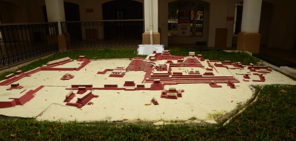 Bon voilà, me voici arrivé à l’entrée du site. Contrairement à ce que m’indique mon Routard, ici, il faut payer en lempiras ou en dollars. Pas en quetzales. Ok, je range ma monnaie guatémaltèque et je paye en monnaie de singe. À Dieu ma liasse de lempiras ! En tournant la tête, on peut admirer une maquette très bien détaillée de l’ensemble du site.
