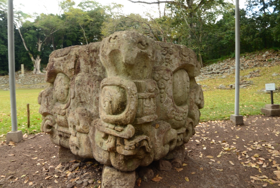 Au milieu de la place, impossible de passer à côté de l’autel Q, situé au pied du temple 16. Une copie. L’original datant de 763 apr. J.-C. se trouve dans le musée du site. C’est une des pièces maîtresses de Copán qui a pu être entièrement déchiffré, apportant la preuve de l’importance politique et culturelle de la ville. Ses bas-reliefs représentent la séquence dynastique des seize souverains de Copán, chacun assis en tailleur sur son propre nom.