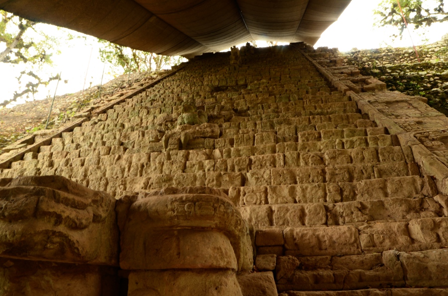 Dans le prolongement du jeu de pelote, impossible de passer à côté de l’exceptionnel escalier hiéroglyphique de Copán. Connu dans le monde entier. Alors certes il est couvert d’une bâche protectrice pour empêcher les pluies de le raviner et de l’éroder (dommage pour les photos !), mais il reste de toute beauté.