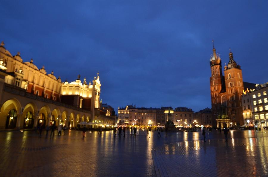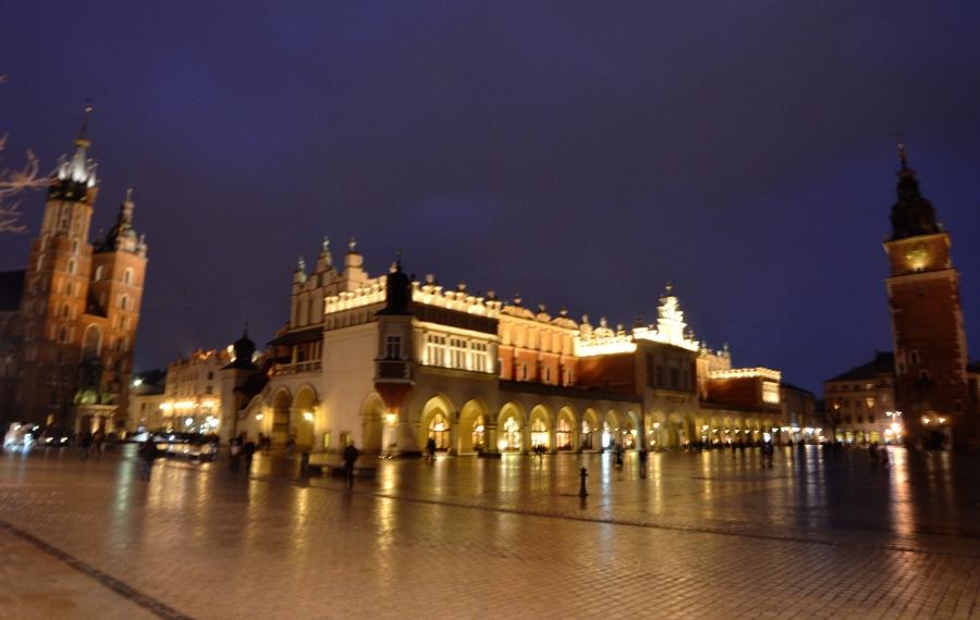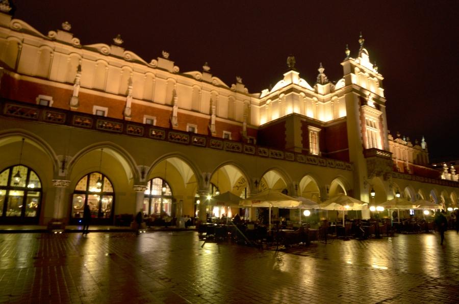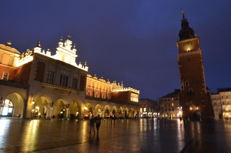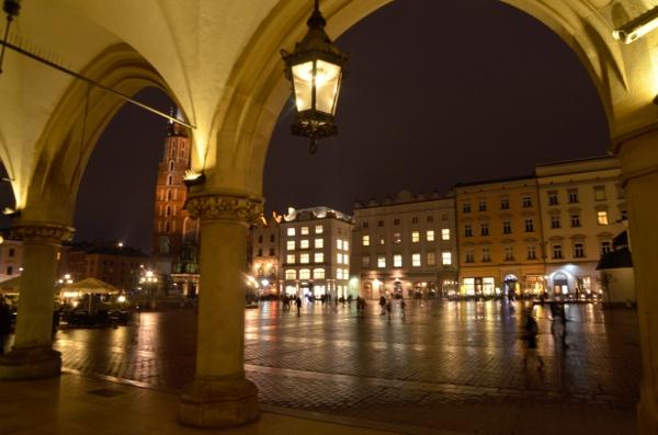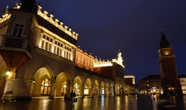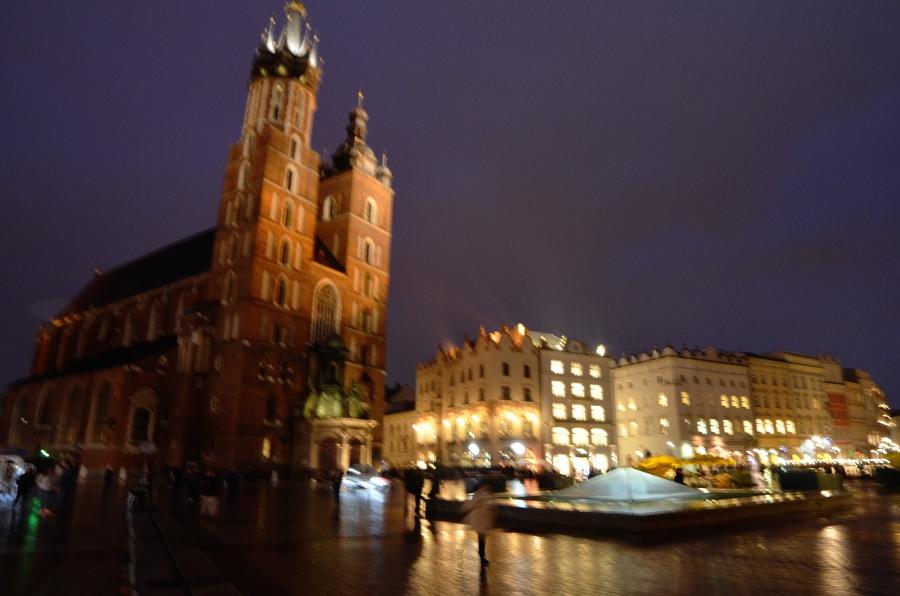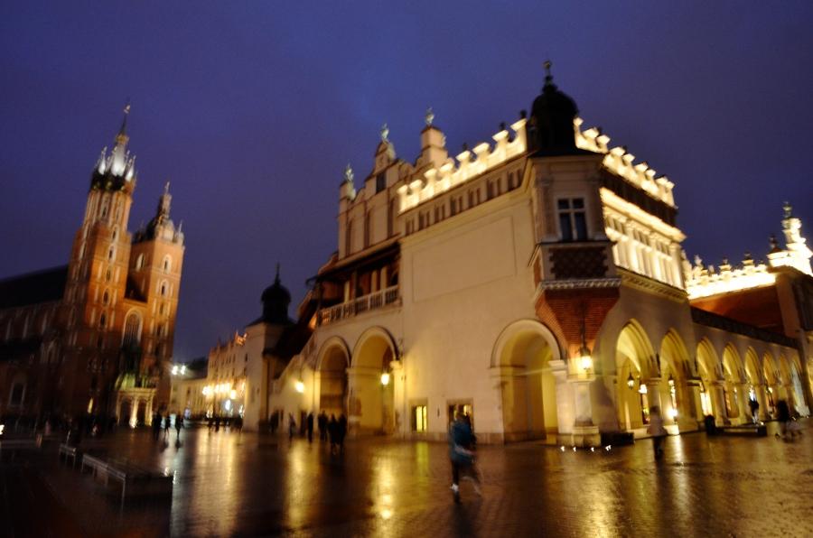 Jeudi 9 mars. La nuit tombe. Je me dirige tranquillement vers Rynek Glowny, la place centrale de la vieille ville de Cracovie. Avec la nuit, tous les monuments sont désormais fermés. Pas de visite donc. Je me contente donc de flâner autour de la place et de profiter du spectacle des lumières qui éclairent tous les bâtiments, les églises, la halle aux grains, les tours… Cracovie est vraiment une des plus belles villes d’Europe. Encore plus belle que Budapest à mon goût. Une véritable ville médiévale que même les Nazis n’ont pas osé détruire complètement comme ils l’ont fait pour Varsovie.