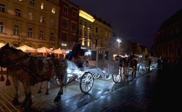Aux quatre coins de la place, les calèches, illuminées elles aussi, attendent patiemment les touristes pour une agréable balade nocturne au cœur de la ville médiévale.