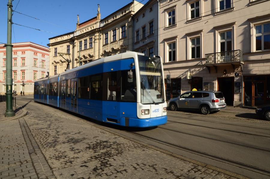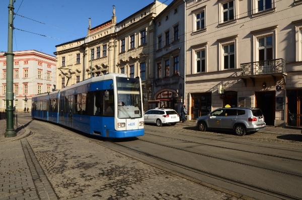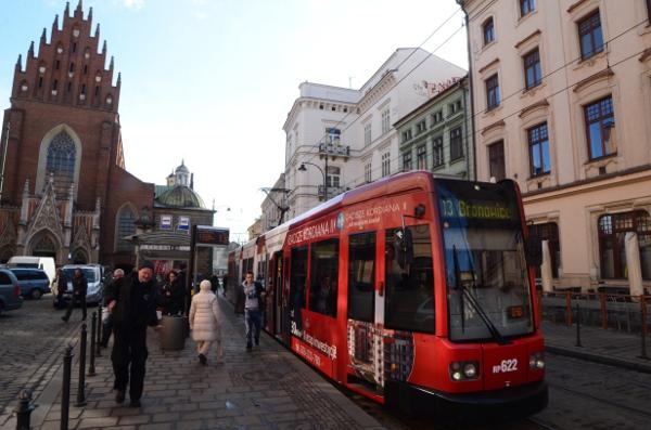 Plus loin, la rue Dominikarski coupe la rue Grodzka pour laisser passer les rames du tramway.