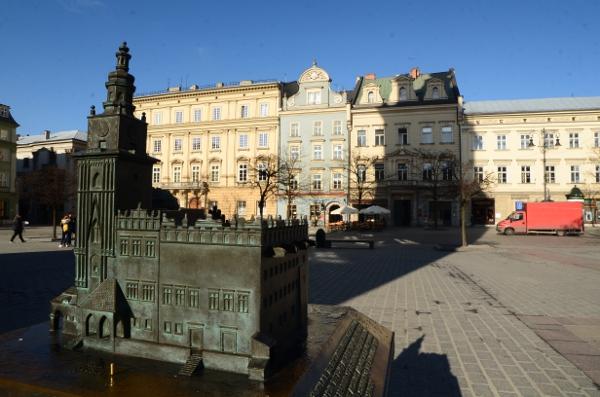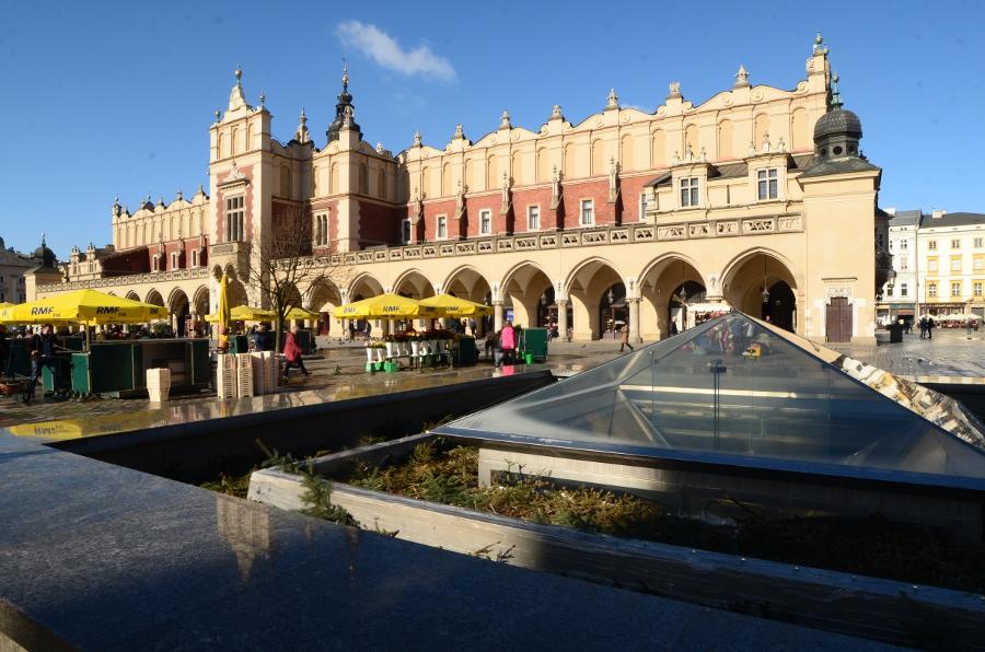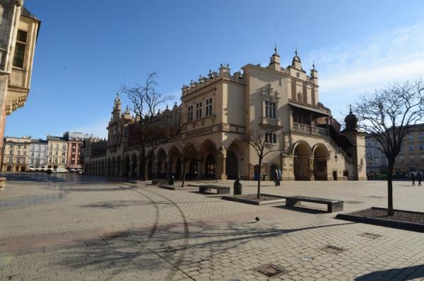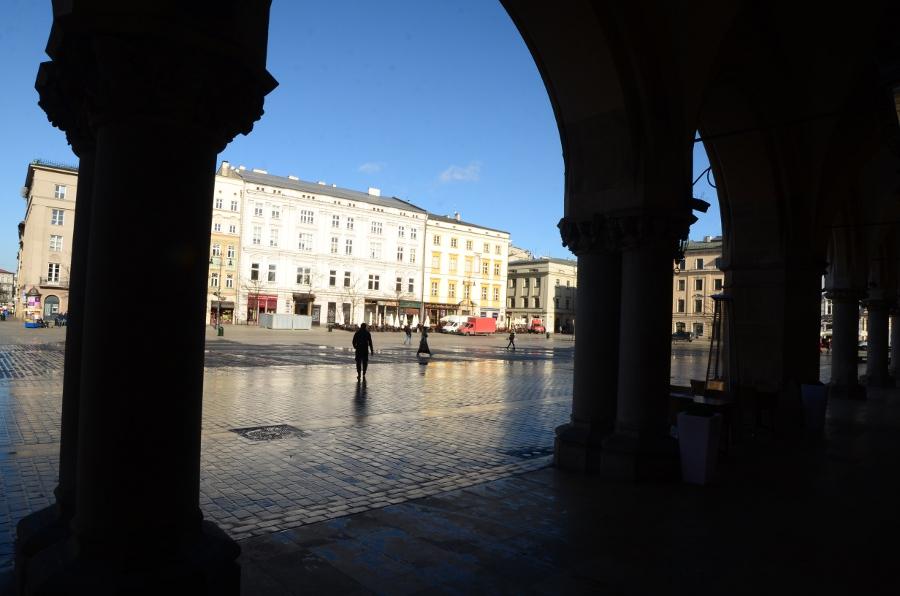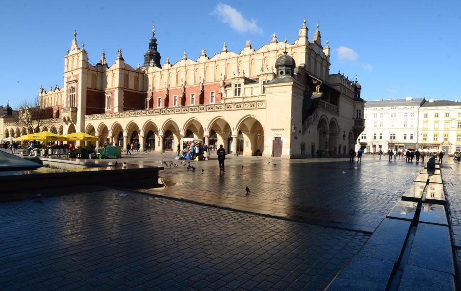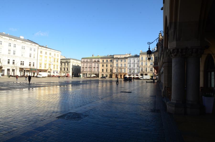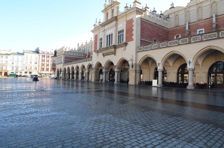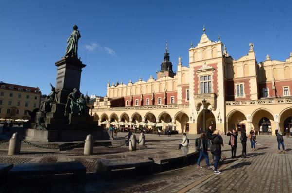 En ce début de matinée, la halle aux draps resplendit sous le soleil rasant. Du haut de son piédestal, la statue d’Adam Mickiewicz profite elle aussi du soleil.