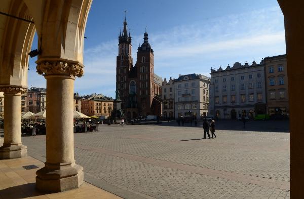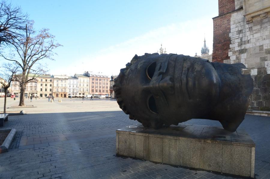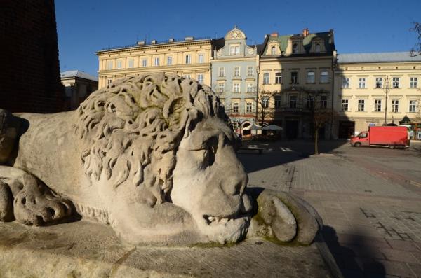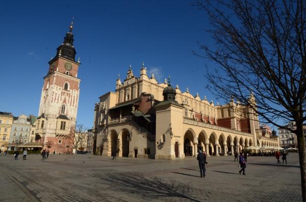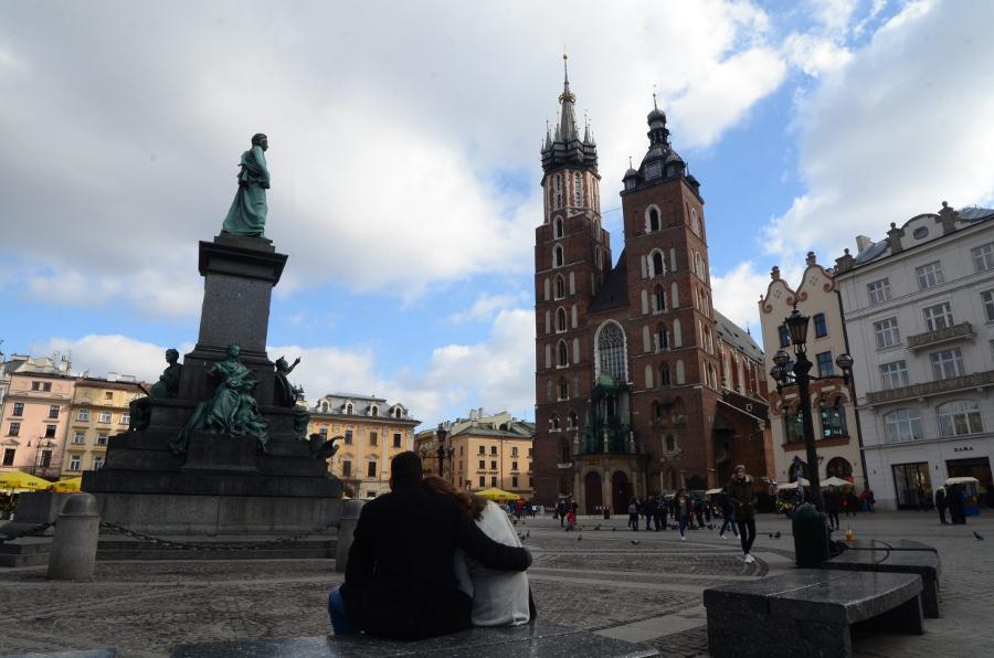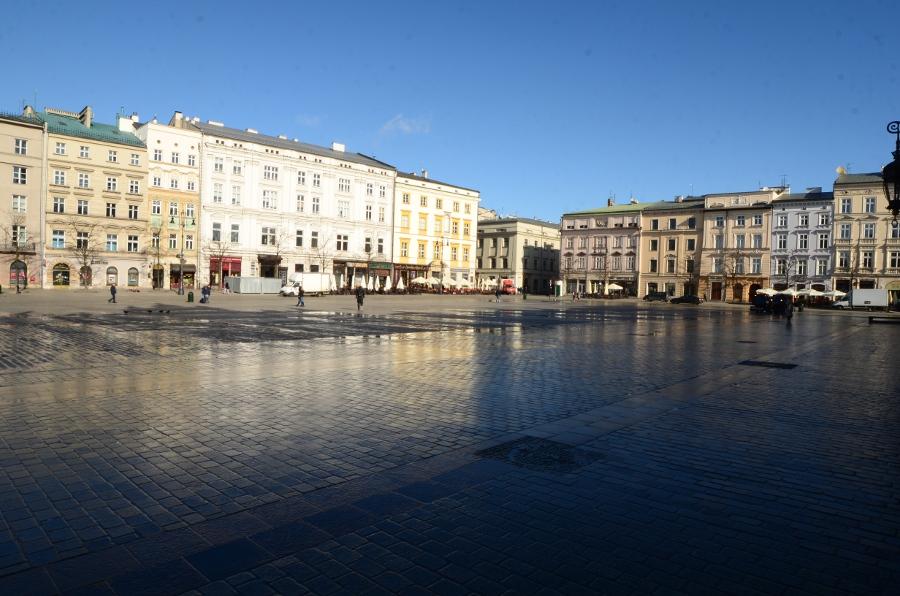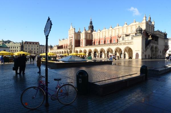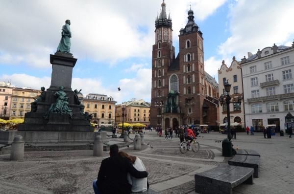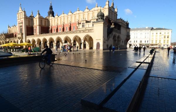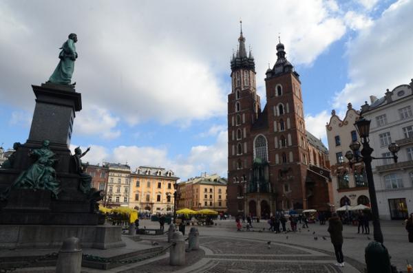 En ce début de matinée, la halle aux draps resplendit sous le soleil rasant. Du haut de son piédestal, la statue d’Adam Mickiewicz profite elle aussi du soleil.