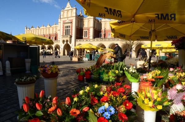 Sur la place, les fleuristes sont déjà à pied d’œuvre. Ce samedi matin, c’est le grand marché aux fleurs de Cracovie. Un vrai régal pour les yeux en ce printemps qui approche.