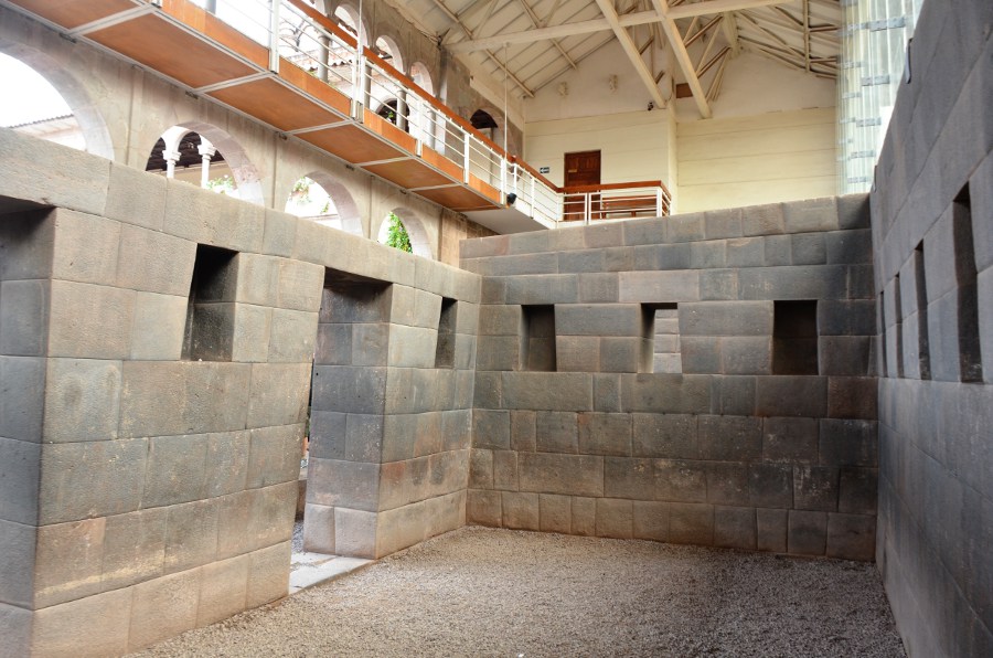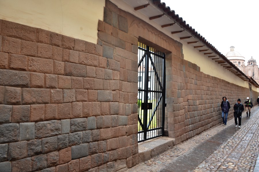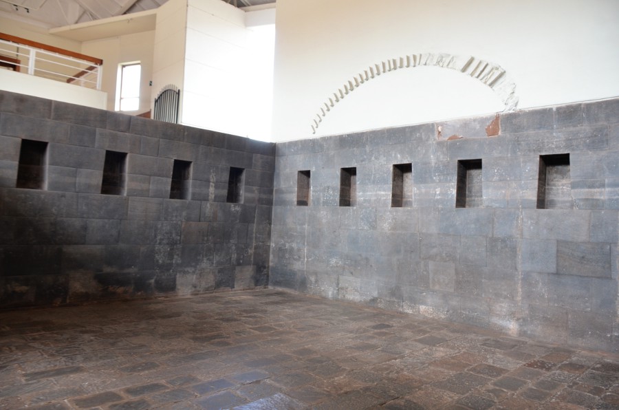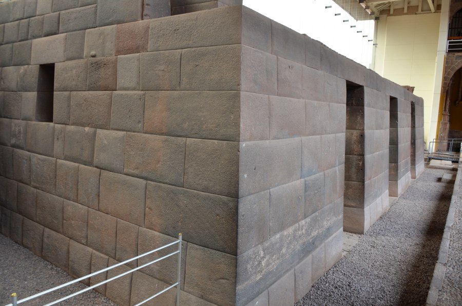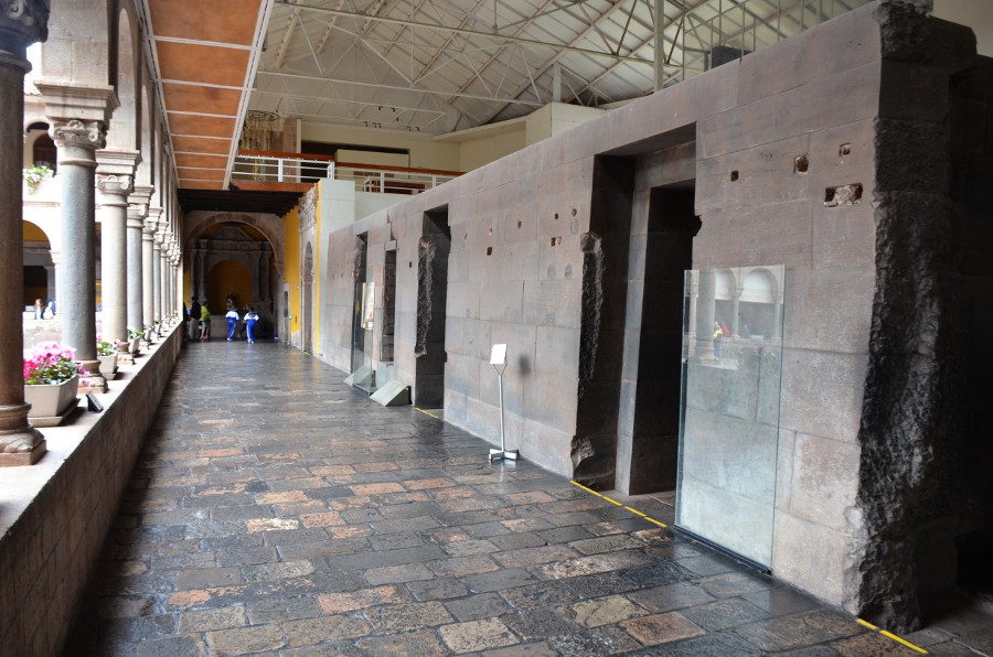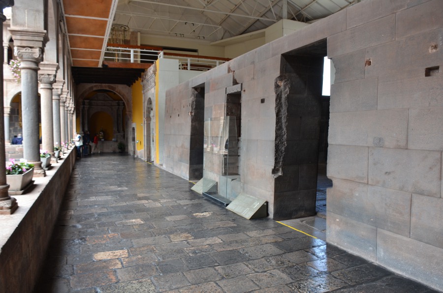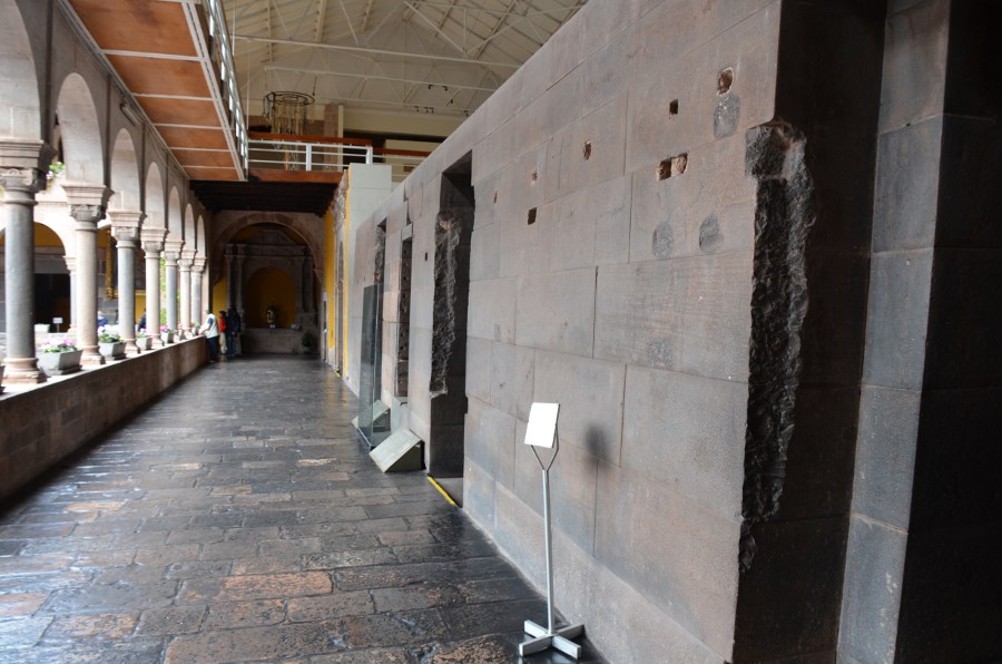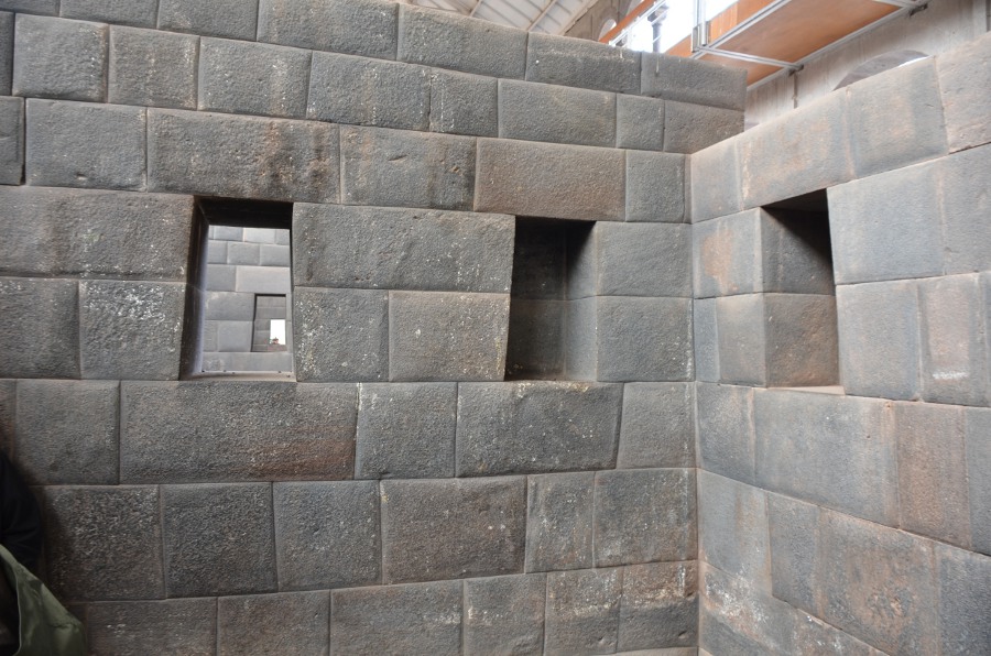 Partout autour du cloître, les murs incas du Temple du Soleil, encore intacts, impressionnent par leur taille imposante et par l’ajustement parfait de leurs pierres gigantesques. Pas une ne se ressemble. Il y a même des ouvertures pratiquées en enfilade qui permettent de voir à travers les murailles d’un bout à l’autre du mur. Il faut imaginer la stupeur des conquistadors lorsqu’ils ont découvert le temple.