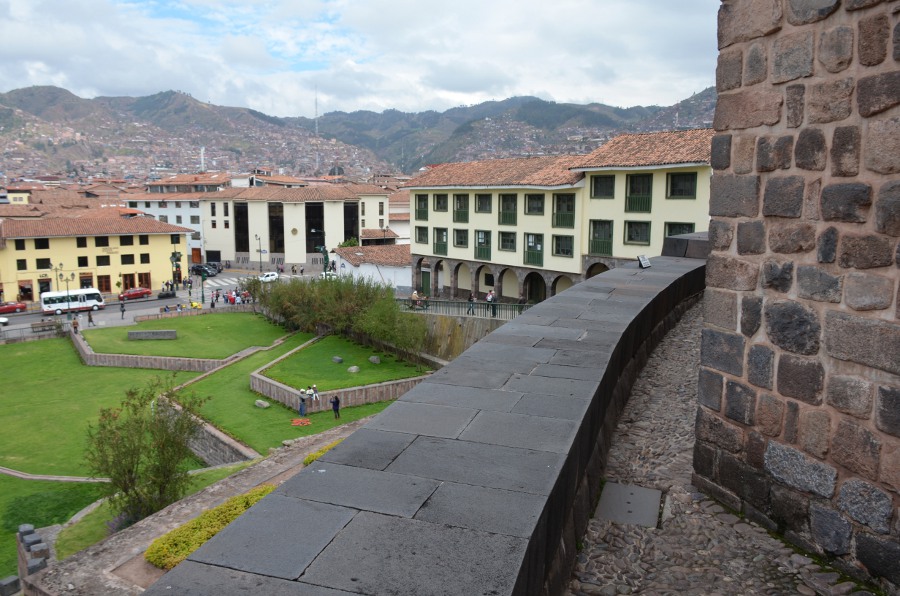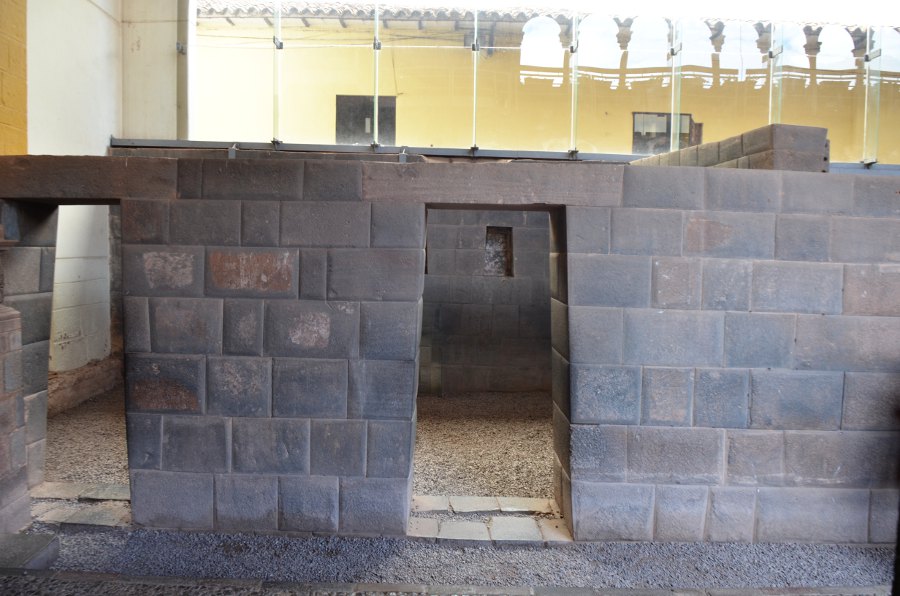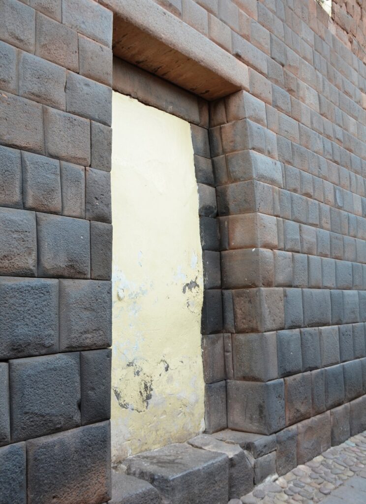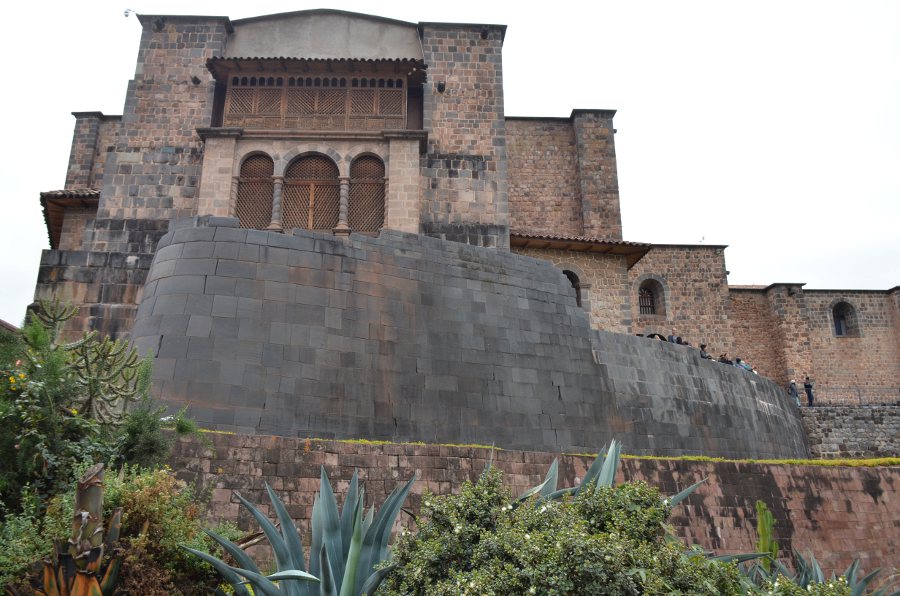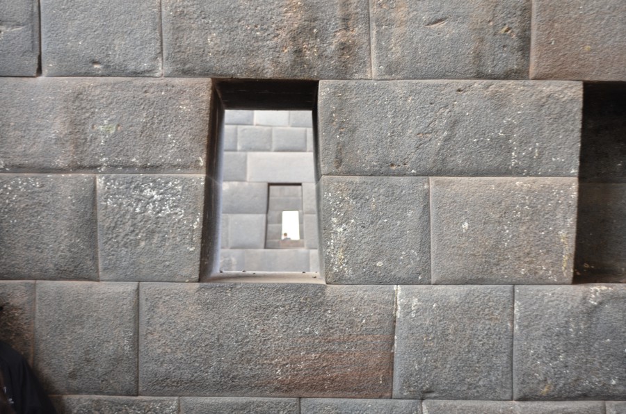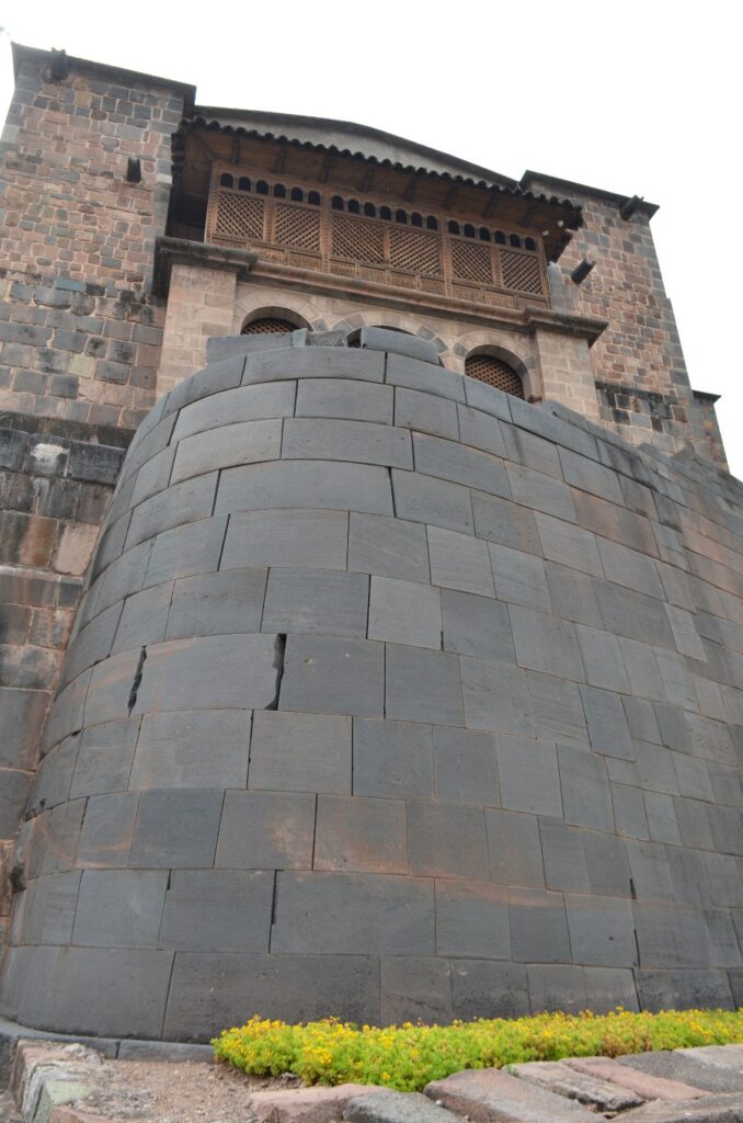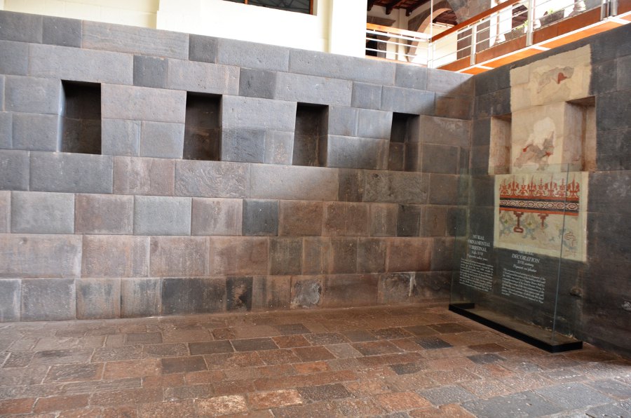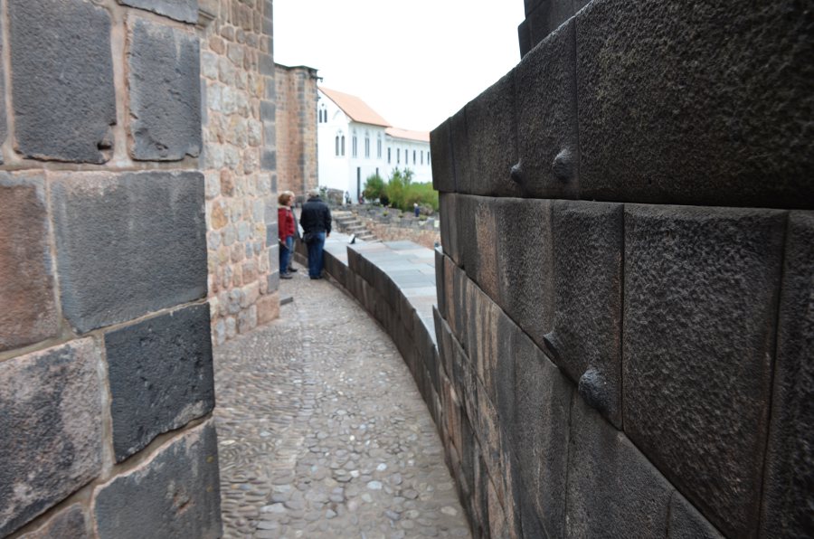 Partout autour du cloître, les murs incas du Temple du Soleil, encore intacts, impressionnent par leur taille imposante et par l’ajustement parfait de leurs pierres gigantesques. Pas une ne se ressemble. Il y a même des ouvertures pratiquées en enfilade qui permettent de voir à travers les murailles d’un bout à l’autre du mur. Il faut imaginer la stupeur des conquistadors lorsqu’ils ont découvert le temple.