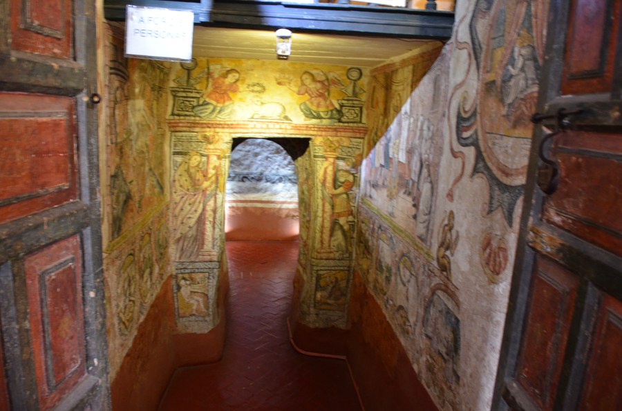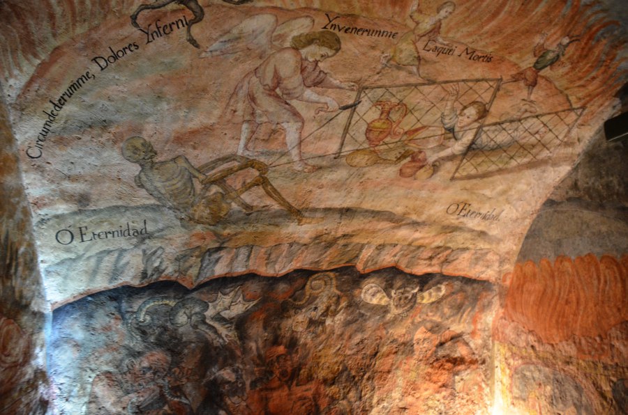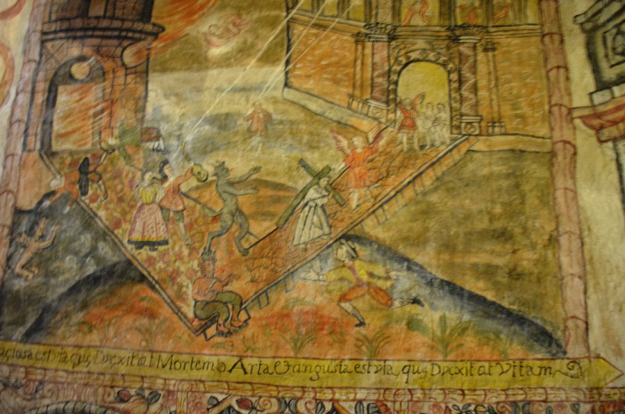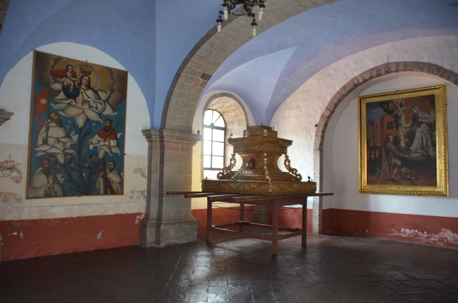 Mais le plus extraordinaire est sans conteste la cellule où le père Francisco Salamanca vécut, cloîtré durant onze ans, peignant chaque portion de mur. On trouve tour à tour le paradis, rieur et peuplé d’angelots, et de l’autre l’enfer où soufflent les flammes et déambulent squelettes et diablotins. À l’étage, ne pas manquer la pinacothèque où trône la Sainte Famille de Rubens et une Piéta andine où le Christ est coiffé d’un bonnet indien et la vierge habillée de la tenue traditionnelle des indiennes Tinta.
