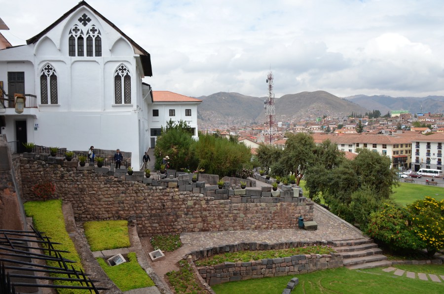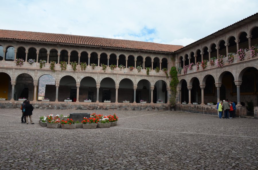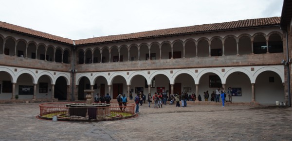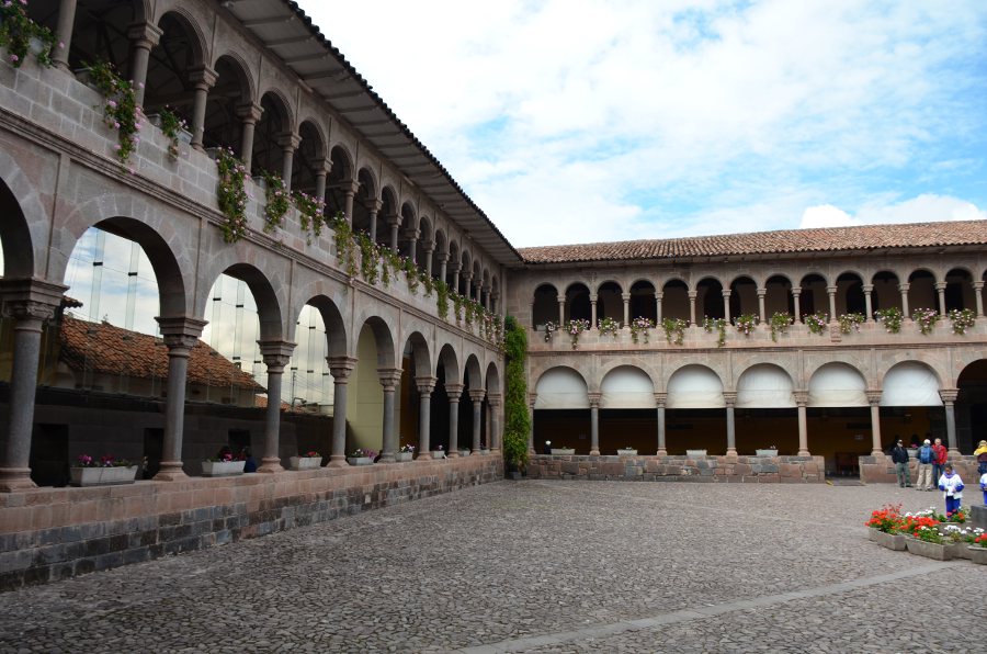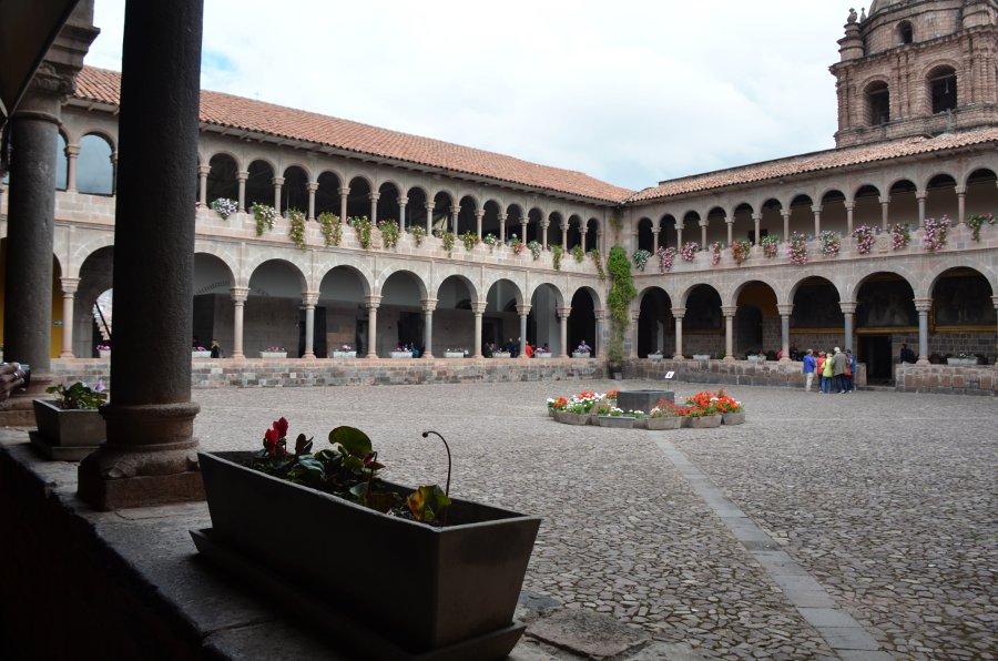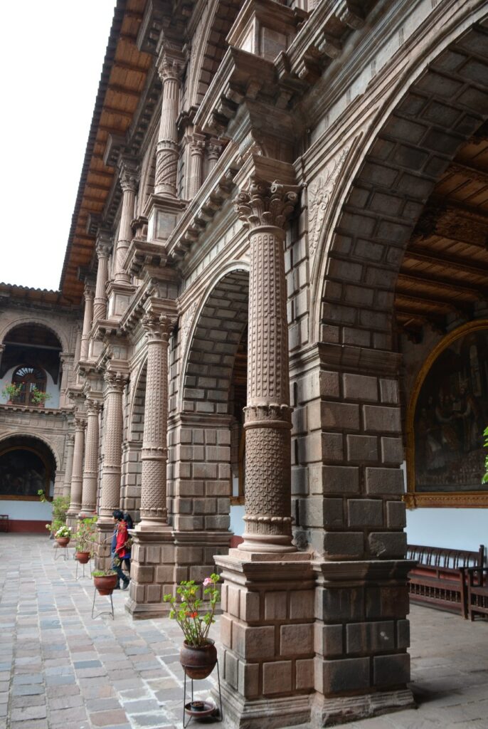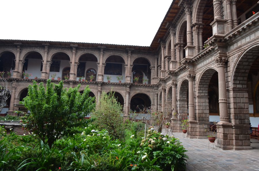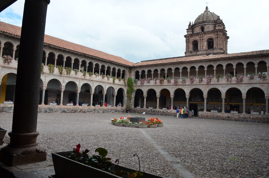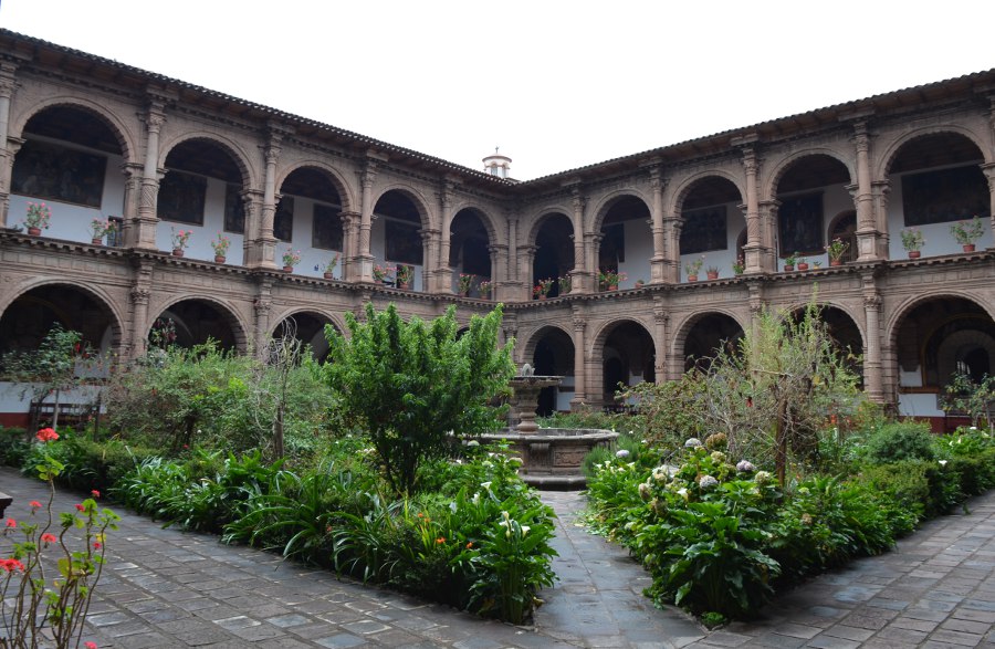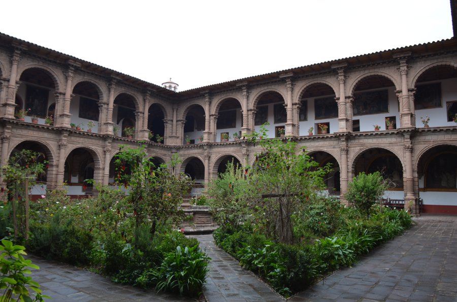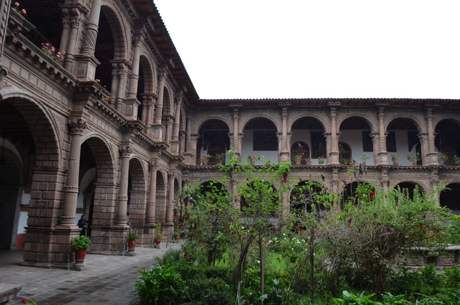 Coricancha, une fois pillé de tout son or, fut cédé à l’ordre des Dominicains. Une partie des structures fut conservée pour bâtir le monastère, une autre réutilisée pour élever l’église. Au centre du monastère fut édifié l’extraordinaire cloître. Pour moi, le plus beau que j’ai pu voir à Cuzco.