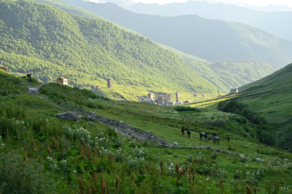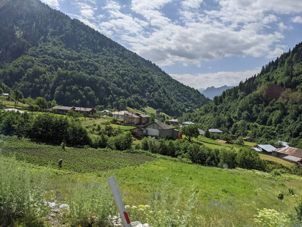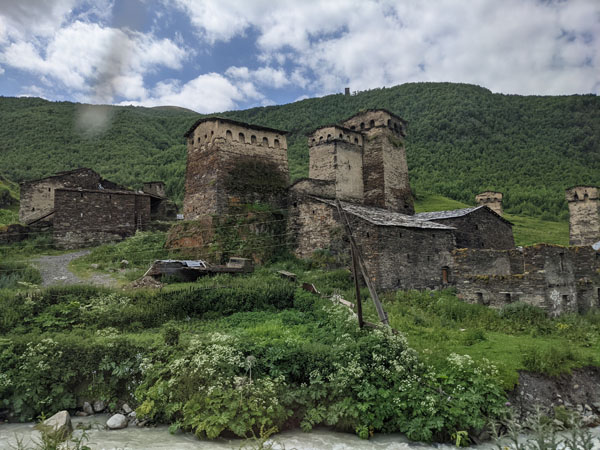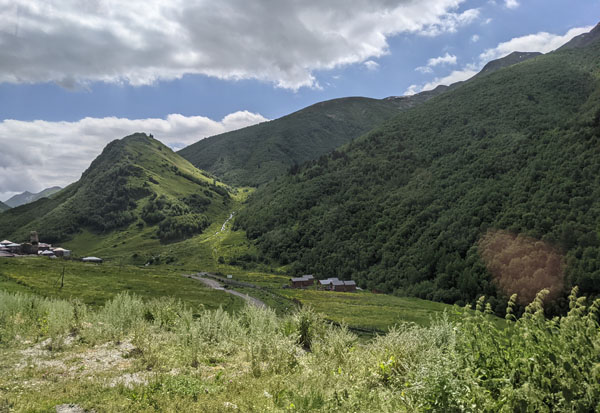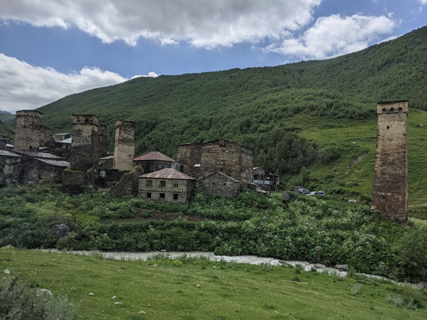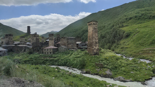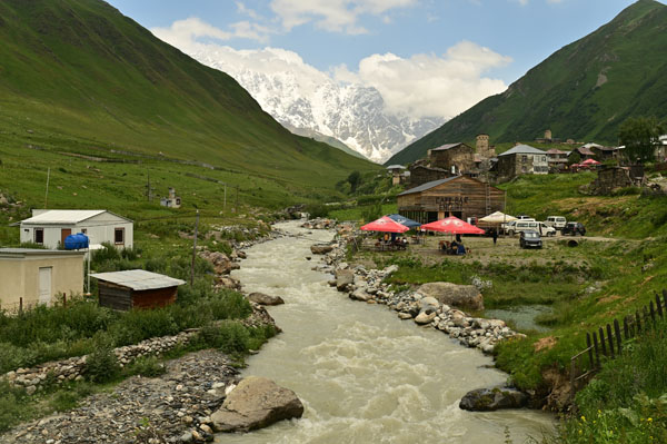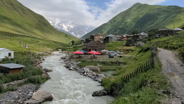 Située au pied du Shkhara, l’un des plus hauts sommets du Caucase, la route vers la ville est d’une beauté sans nom. La route suit (et traverse plusieurs fois) la rivière Patara Enguri.