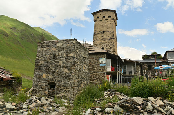 Nous voici donc arrivés au village d’Ouchgouli. Le minibus vous dépose en plein milieu du premier pont qui enjambe la rivière Enguri. De là, de nombreux taxis attendent pour prendre le relais, et d’autres chauffeurs encore qui font la navette régulière entre Mestia et Ouchgouli. Le temps de prendre quelques renseignements, et nous nous dirigeons au cœur du village historique, rive droite, où se dressent la plupart des tours défensives svanes.
