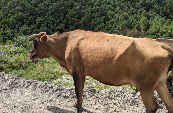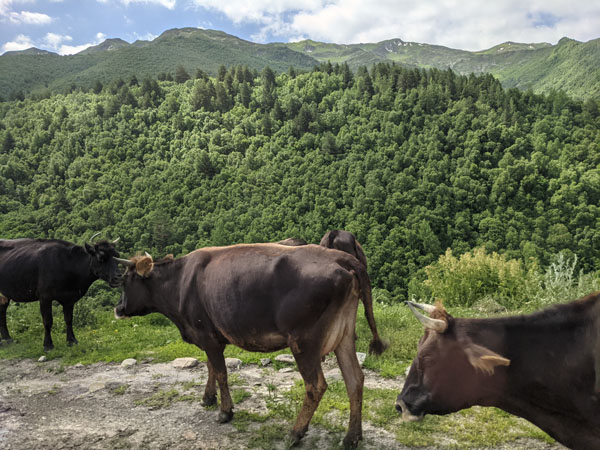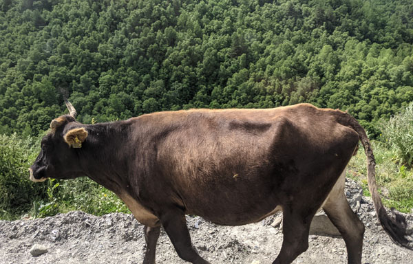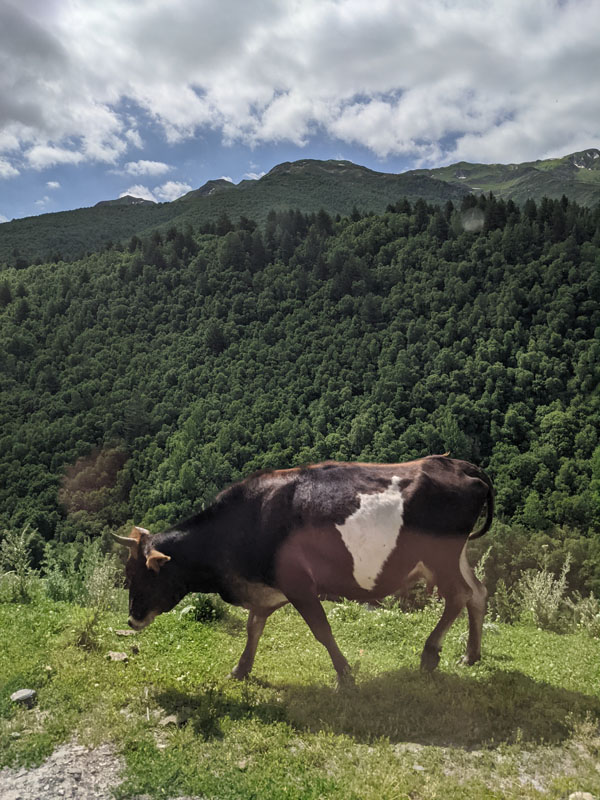 Après un peu plus d’une heure de route, nous voici arrivés enfin à Ouchgouli. Là, nous sommes d’abord accueillis par des troupeaux de vaches qui se promènent en toute liberté. Autant vous le dire toute de suite… Les habitants les plus nombreux de ce village de haute Svanétie sont les vaches ! Elles sont des centaines à se promener dans les rues du village. Et qui dit vaches, dit bouses ! Attention à l’endroit où vous mettez les pieds ! Les rues d’Ouchgouli sont en effet maculées, voire parfois recouvertes de bouses !
