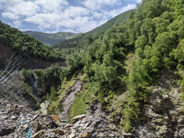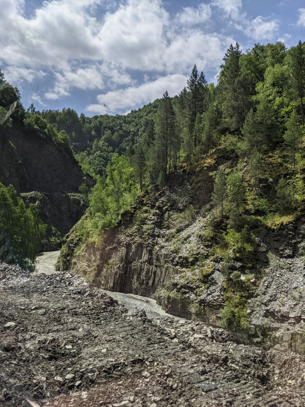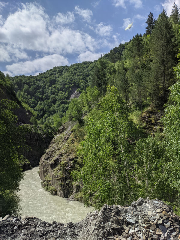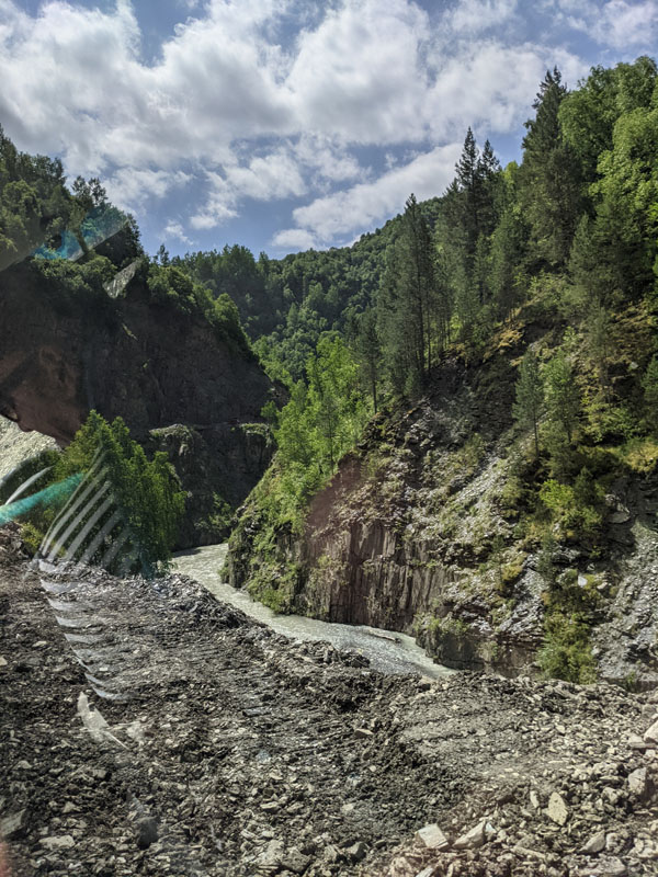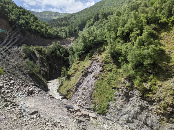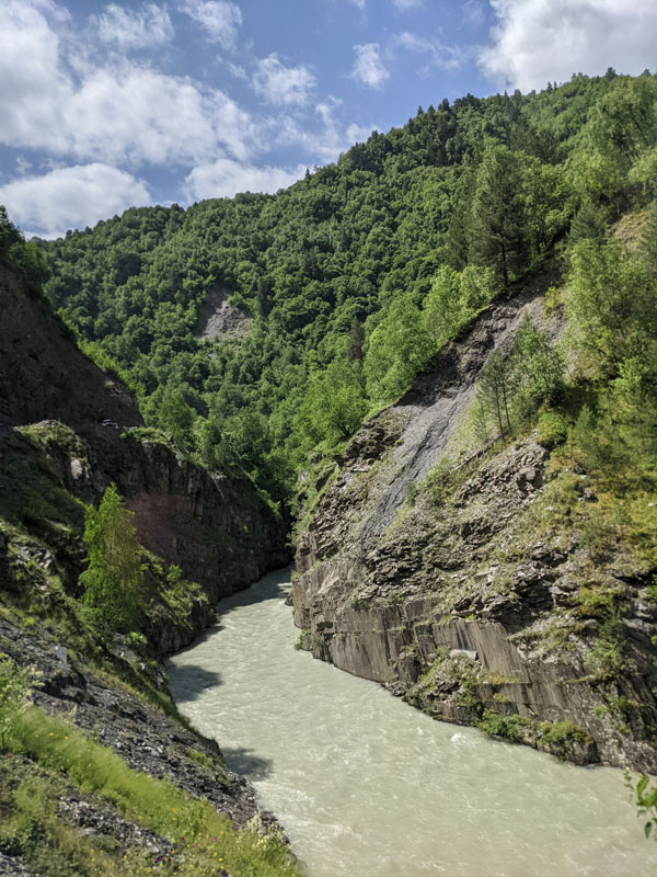 Mais avant de vous parler de ce petit village du bout du monde classé au patrimoine mondial de l’humanité pour son incalculable nombre de tours svanes encore bien conservées, il me faut faire une petite parenthèse sur la rivière Enguri qui traverse toute la région. Pourquoi vous parler de cette rivière ? Parce qu’elle est incontournable dans le paysage de la haute Svanétie, et nous verrons plus tard comment elle traverse le village d’Ouchgouli… avec tous les risques que cela peut comporter parfois !