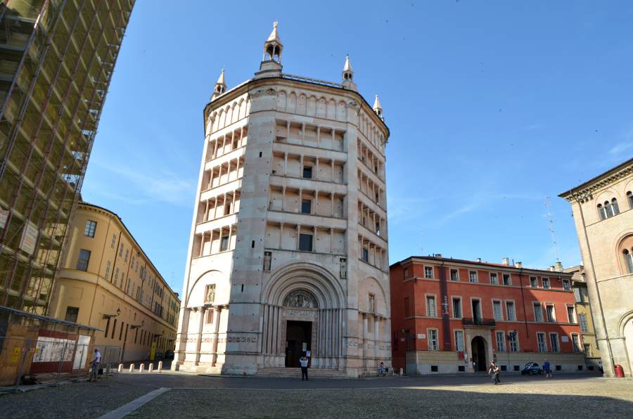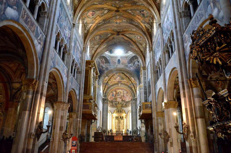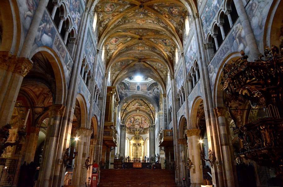 L’héritage des ducs de Parme se lit dans le palazzo della Pilotta, complexe monumental abritant la galerie nationale avec des œuvres du Corrège et du Parmesan, ainsi que le théâtre Farnèse en bois de sapin. Le duomo romanique conserve la coupole peinte par le Corrège, dont la fresque de l’Assomption révolutionna la perspective en plongée.