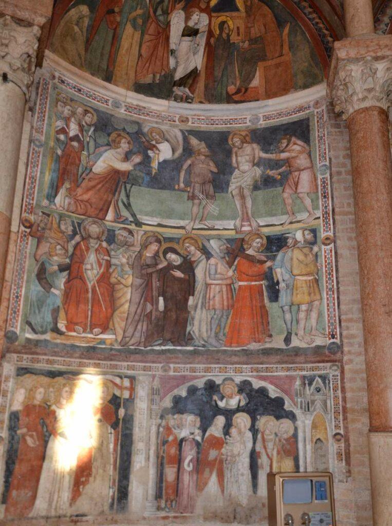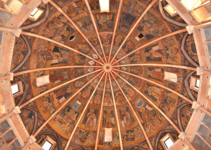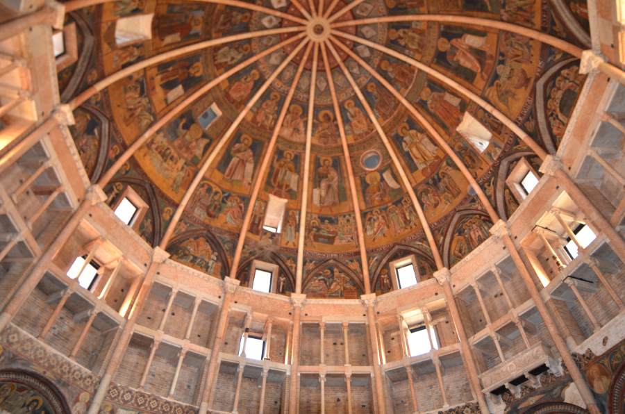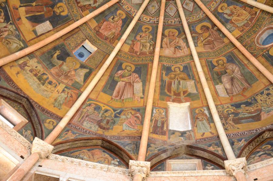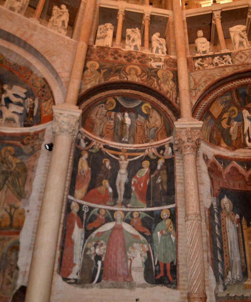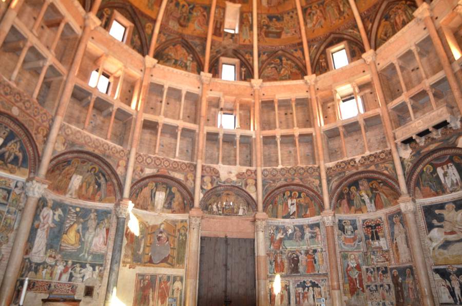 Une fois à l’intérieur, quelle claque ! Les niches et les coupoles sont décorées de fresques du XIIIe, XIVe et XVe siècle, représentant des scènes de la vie du Christ et de ses apôtres. La représentation des mois et des saisons est aussi de toute beauté. À l’extérieur, les sculptures d’Antelami au-dessus des trois portails sont à couper le souffle.