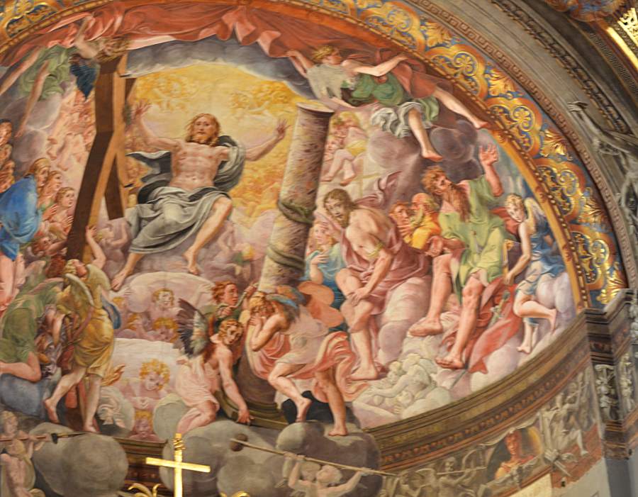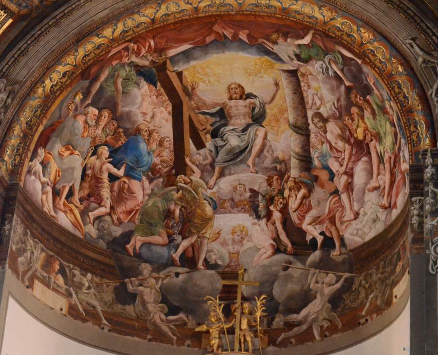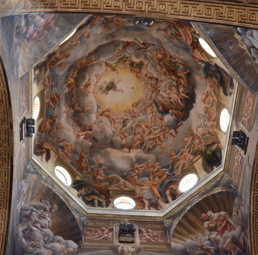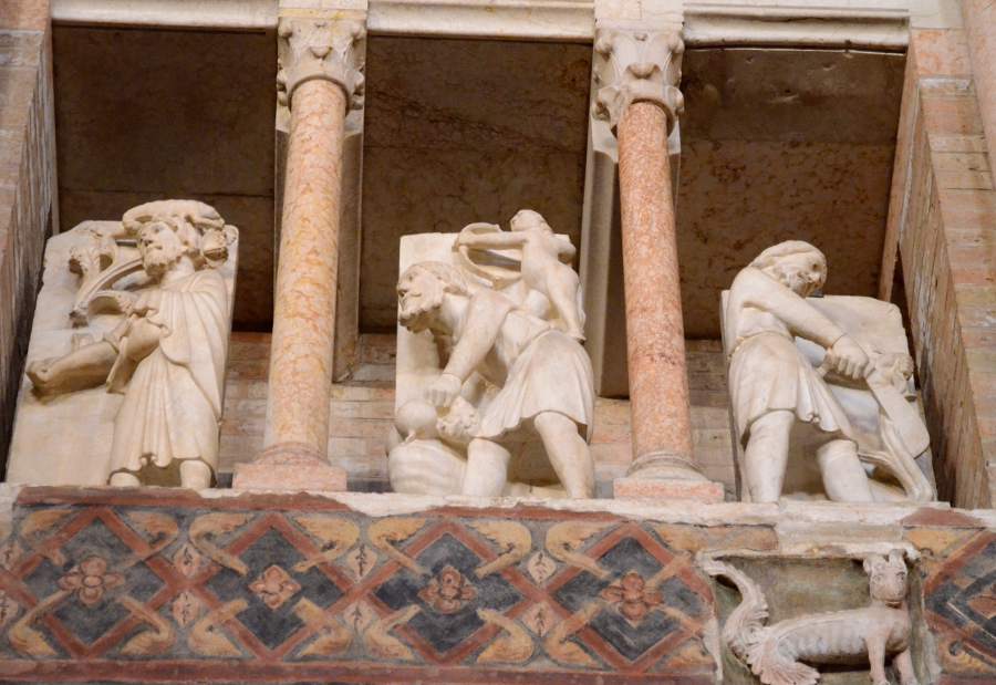 À peine sorti de baptistère, je file droit vers le duomo. Là encore, quelle beauté ! Dommage que le campanile soit hérissé d’échafaudages… Grrrrrrrr… Consacrée en 1106, la cathédrale de Parme est de style roman. Deux magnifiques lions gardent son portail du XIIIe s. Au-dessus, une frise raconte les mois de l’année… En novembre, on tuait déjà le cochon pour faire le jambon de Parme ! Une fois à l’intérieur, le festival continue. L’Assomption de la Vierge du Corrège décore la coupole. Des bas-reliefs recouvrent tous les murs. La Descente de croix d’Antelami, dans le transept droit, est saisissante.