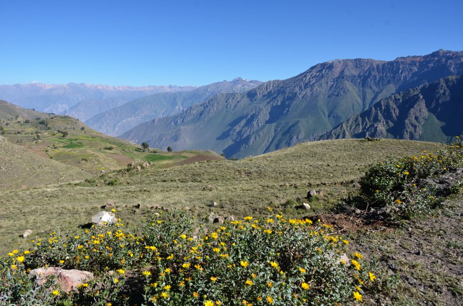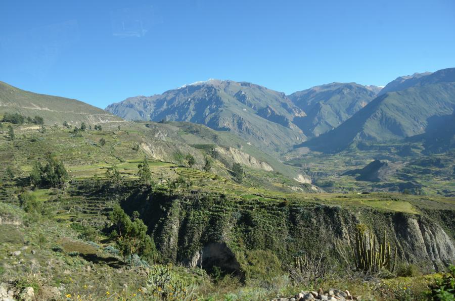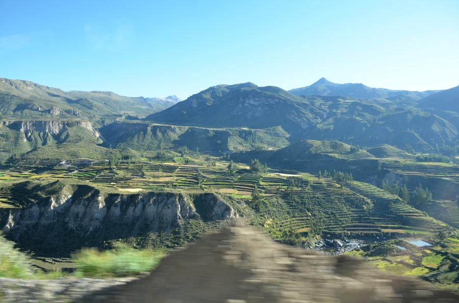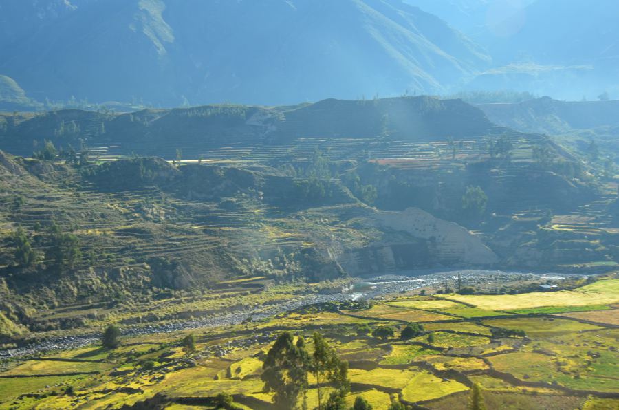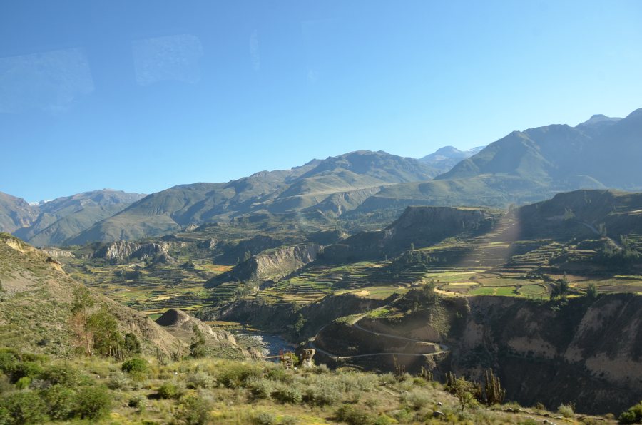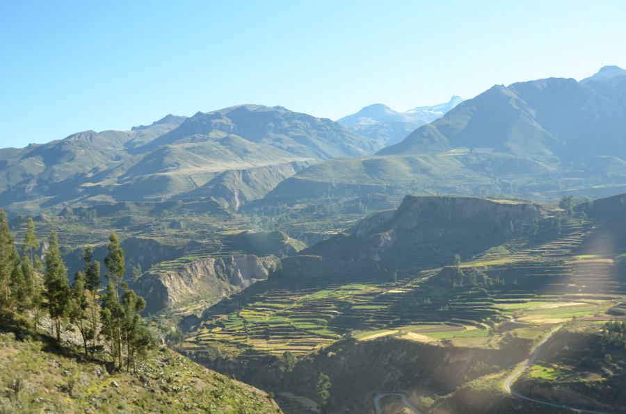 La route est tout simplement sublime, serpentant au sommet de l’altiplano, offrant une vue à couper de souffle sur la chaîne des volcans, la vallée du rio Colca et les anciennes terrasses incas encore aujourd’hui cultivées par les Indiens.
