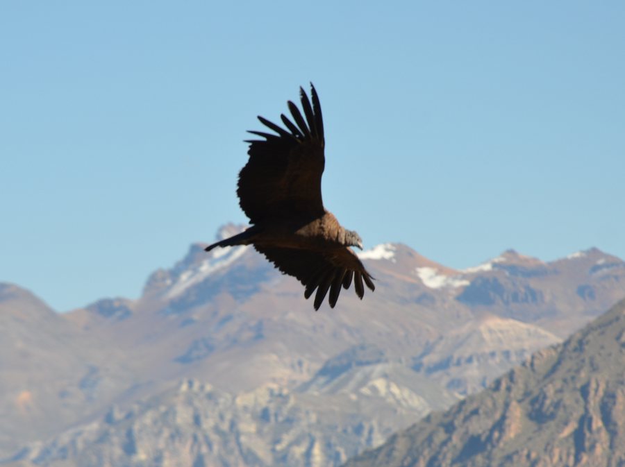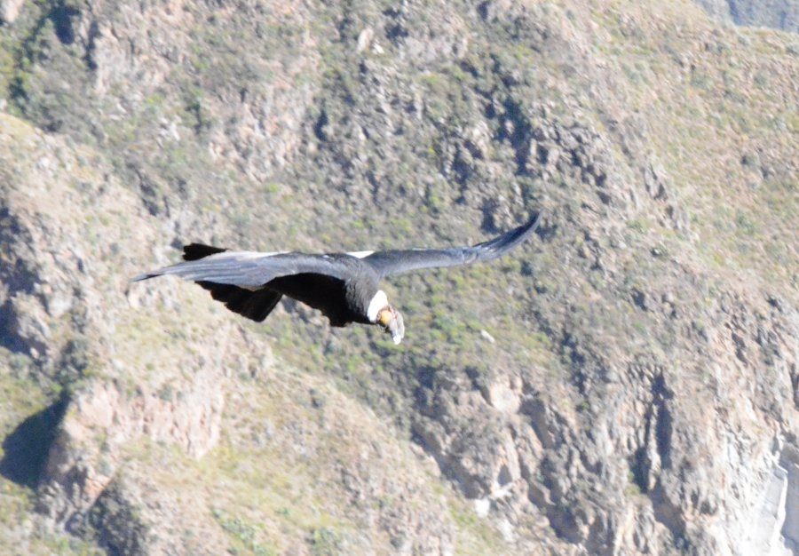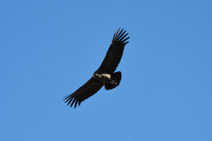 Le spectacle est magnifique, les condors semblant glisser dans l’air, sans jamais battre des ailes, tordant le cou dans notre direction pour nous observer à leur tour. On reconnaît le condor royal à son anneau de plumes blanches autour du cou. Quelle envergure !