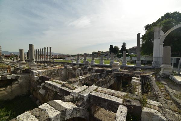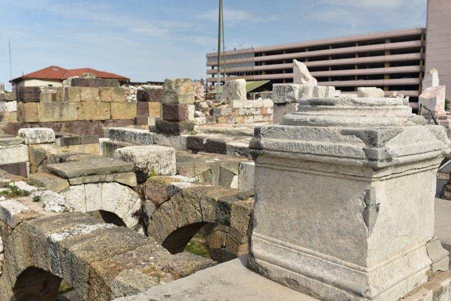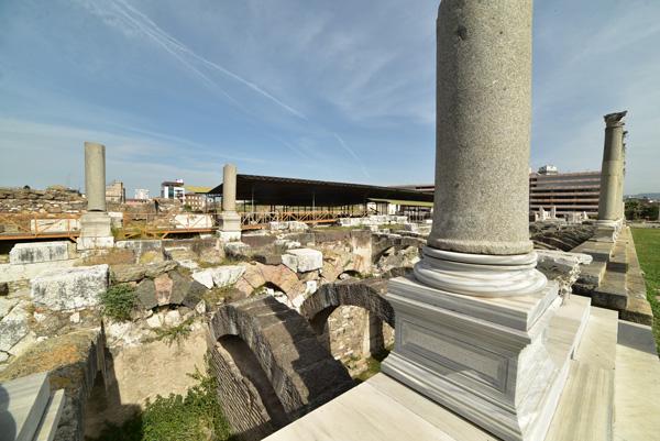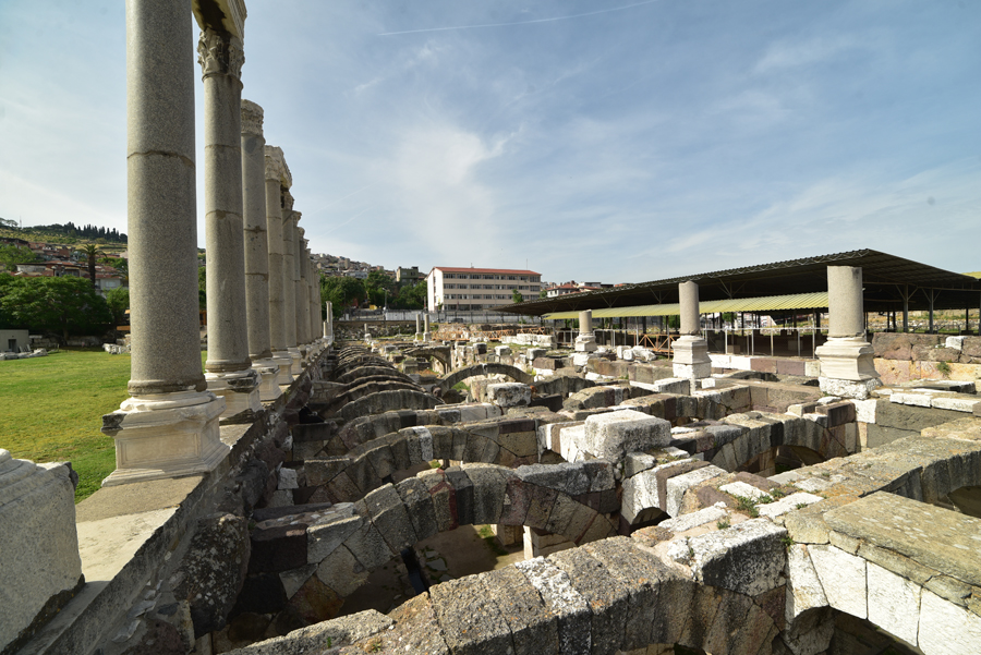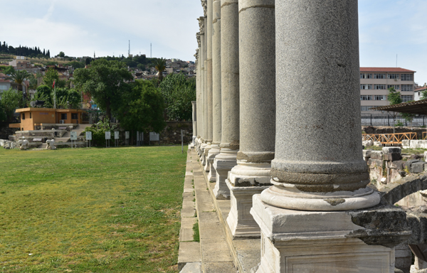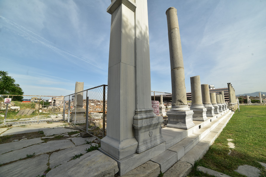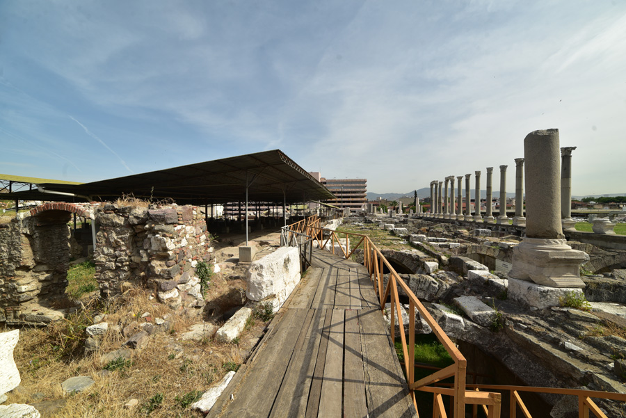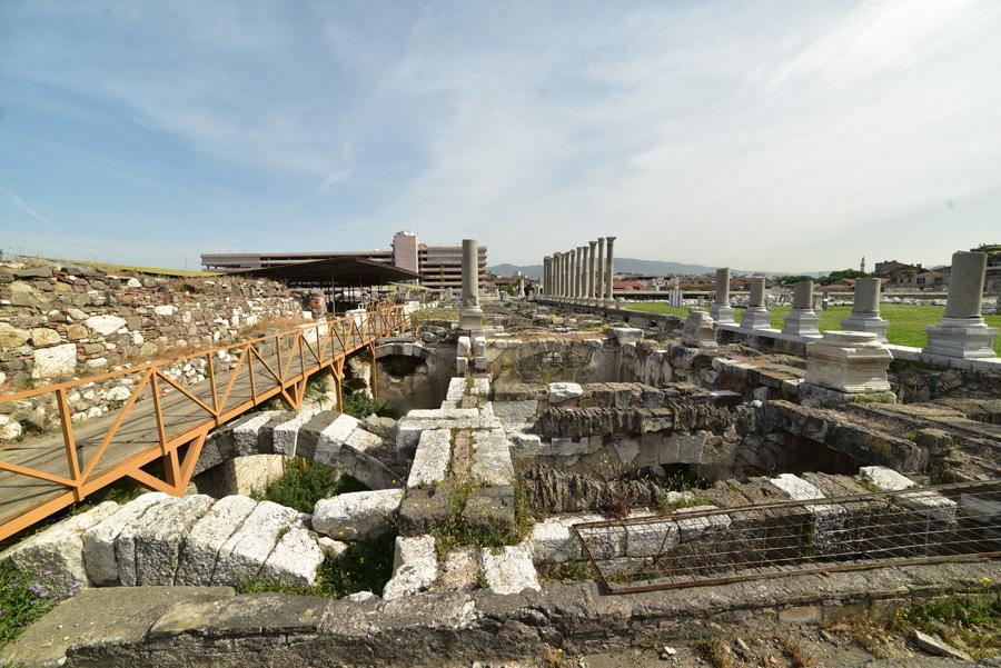 Devant moi s’étendent les ruines de la partie occidentale de la place, laquelle était bordée par une grande basilique au nord et des portiques à l’Est et à l’Ouest. Centre de la cité, l’Agora fut fondée par les Grecs sur les pentes de la colline de Kadifekale, puis reconstruite par les Romains après le tremblement de terre de 178.