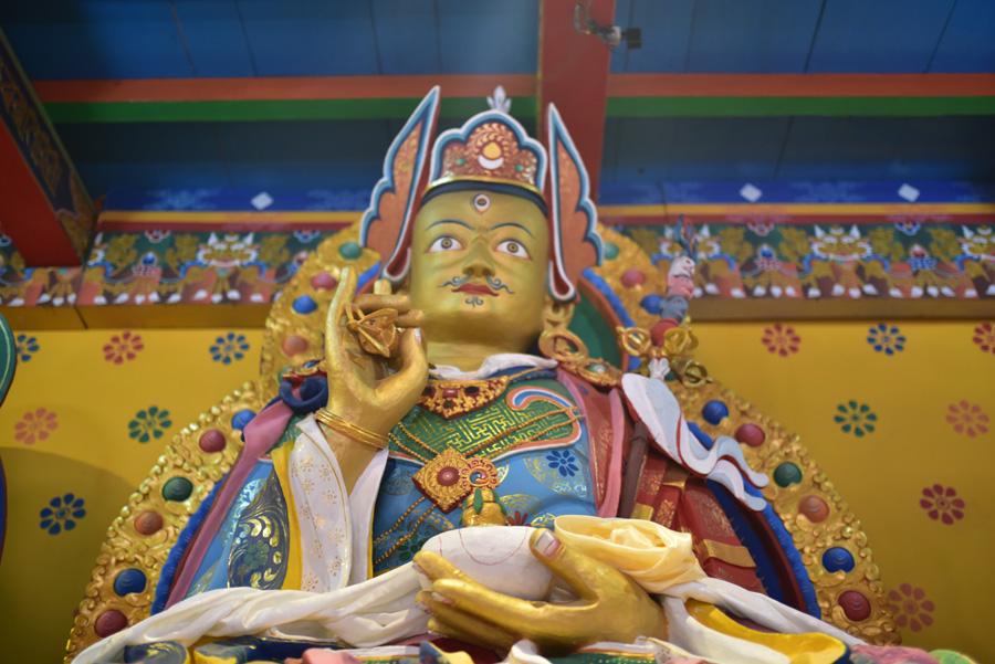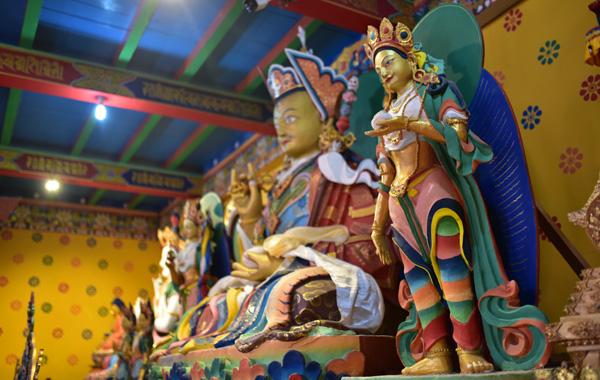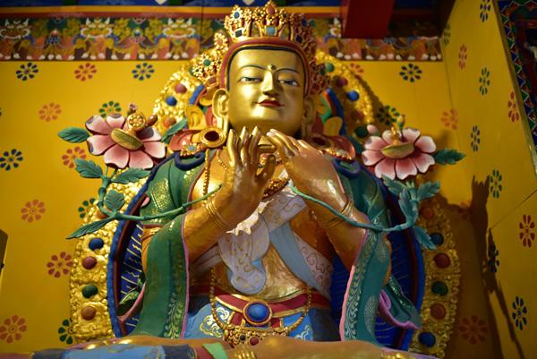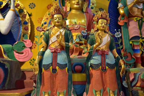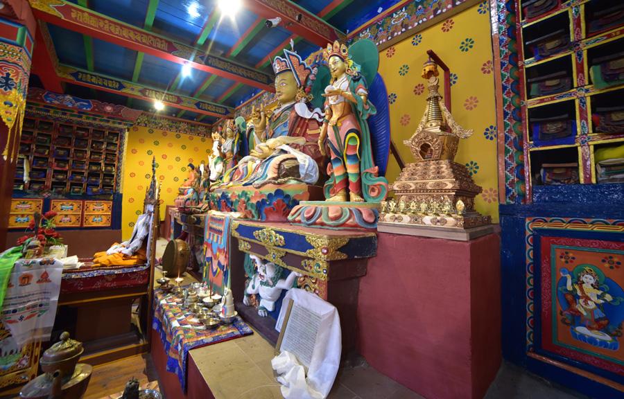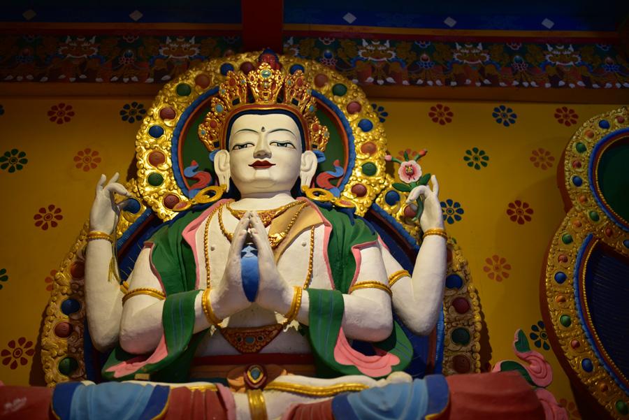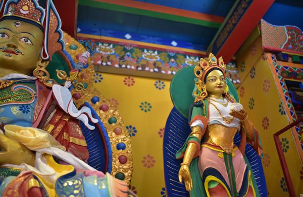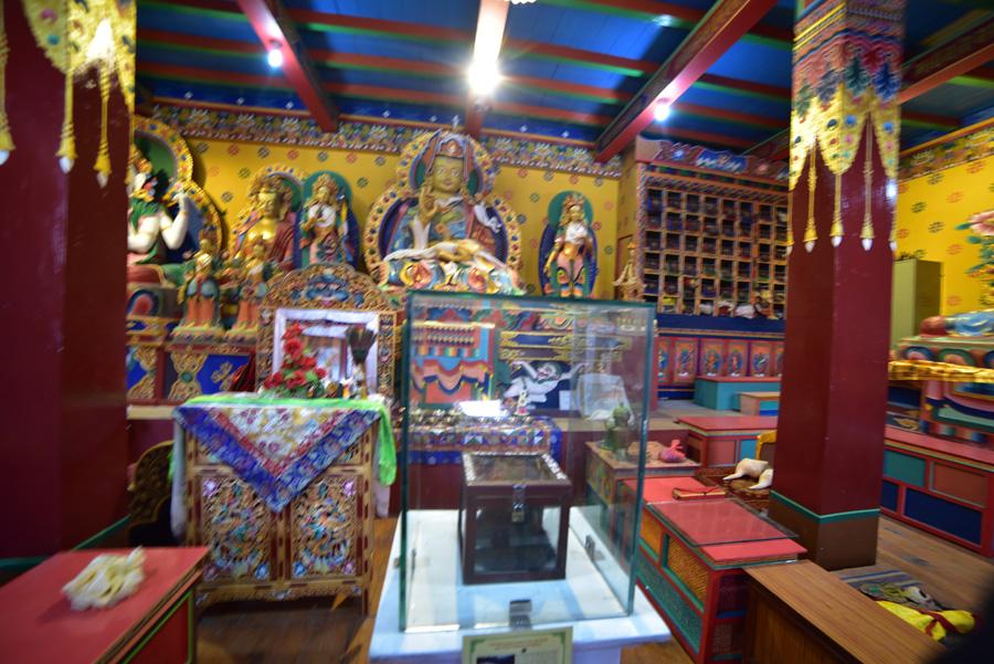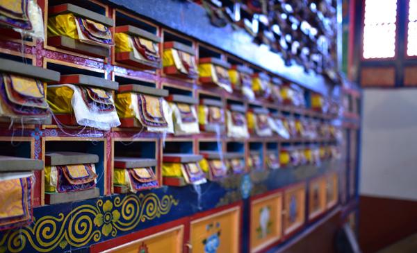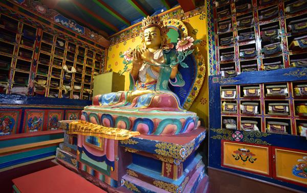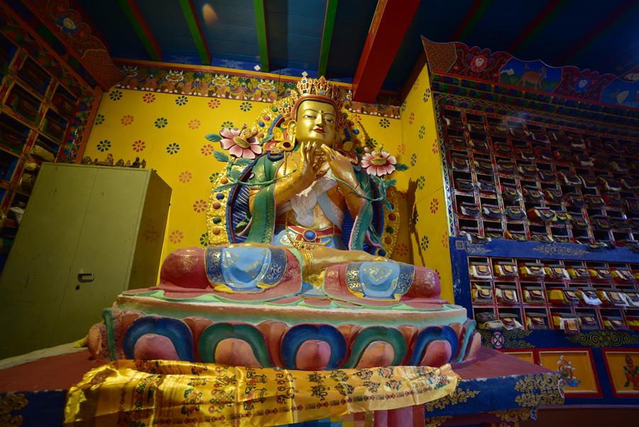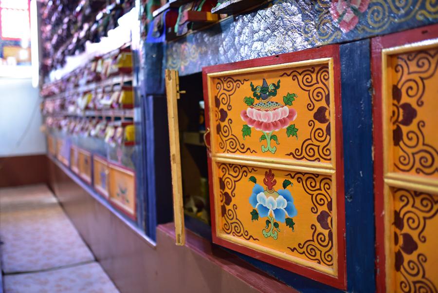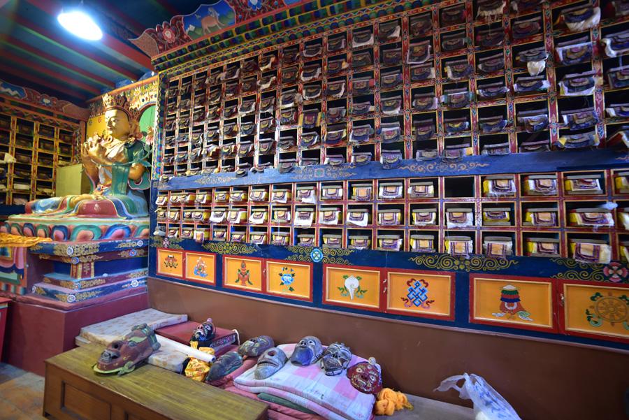 De chaque côté de la statuaire, des milliers de rangements abritent des drapeaux à prières apportés par les croyants et les fidèles du temple.