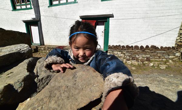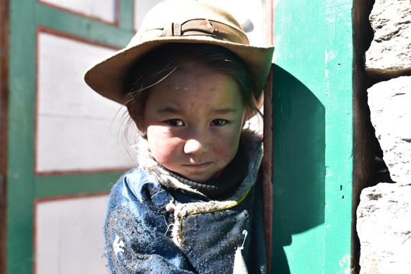 Allez zou, nous reprenons les ruelles en sens inverse. Le nez au ciel pour admirer les cimes des sommets himalayens. À la sortie du village, je retrouve la petite fille qui m’avait interpellé quand nous étions arrivés. Je ne suis pas prêt d’oublier son petit regard espiègle.