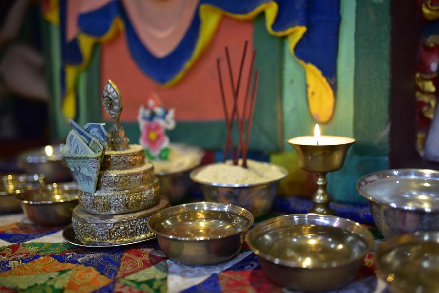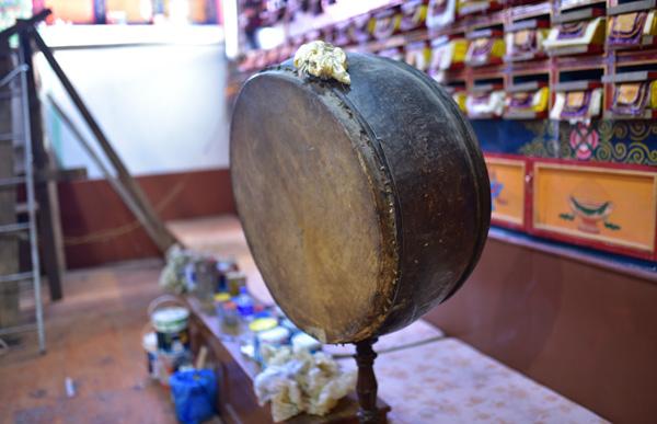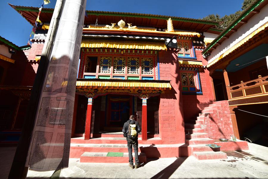 Un peu plus haut, un grand moulin à prières annonce le temple du village. Nous y sommes.