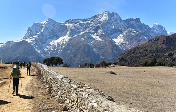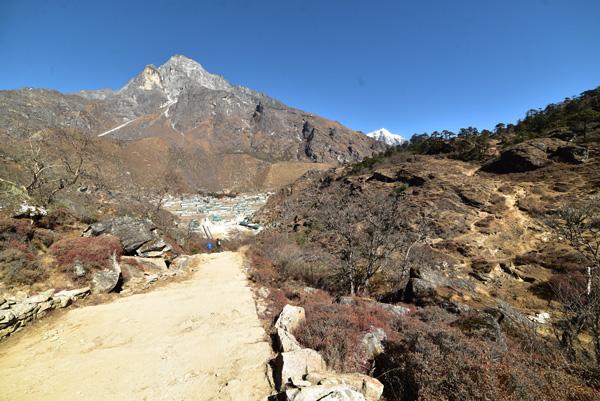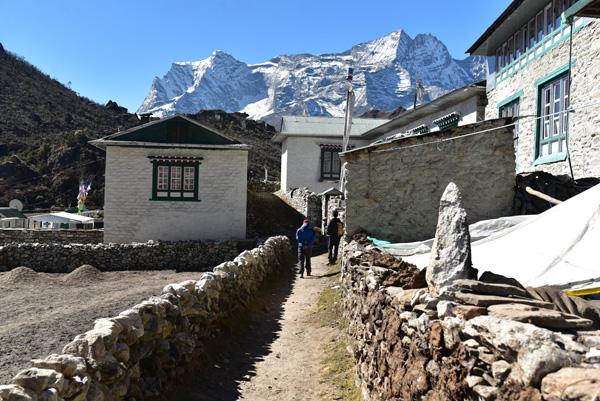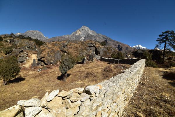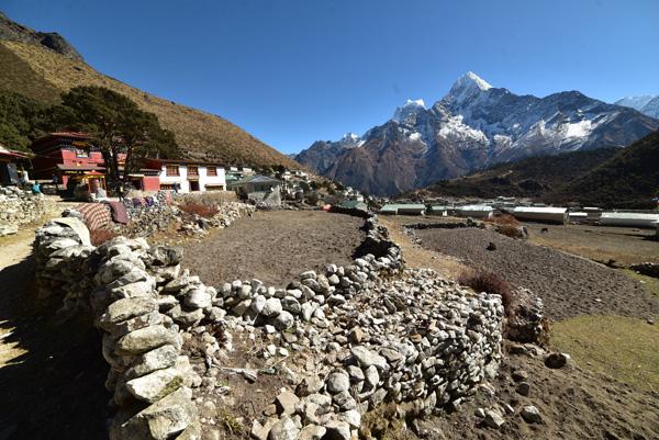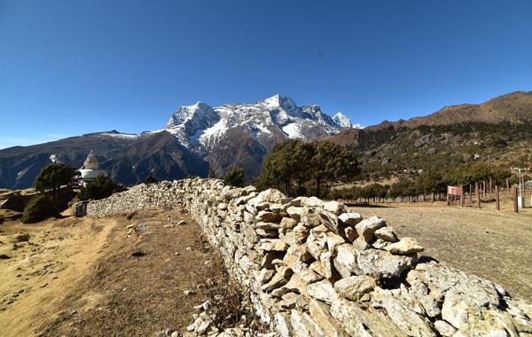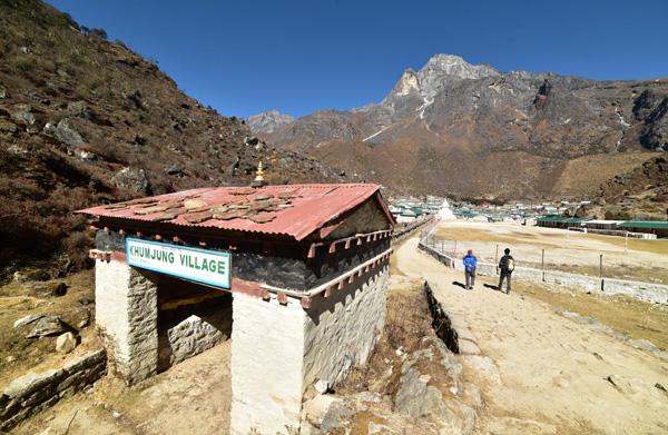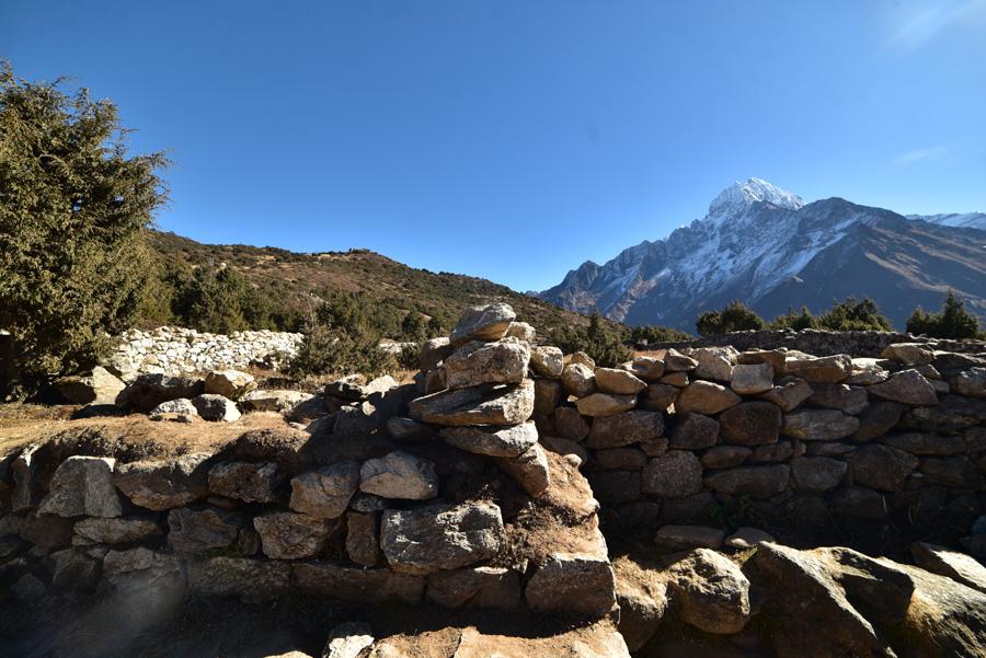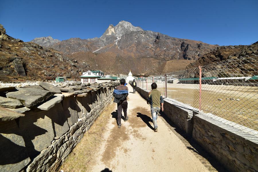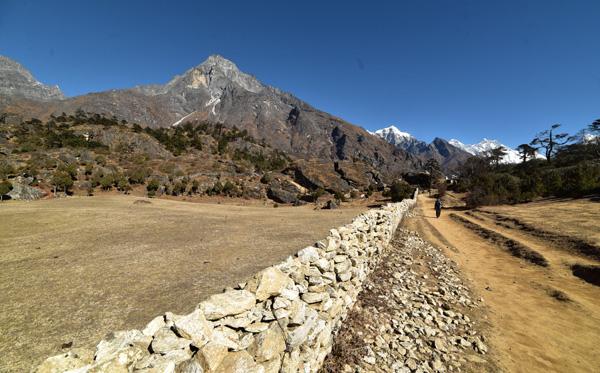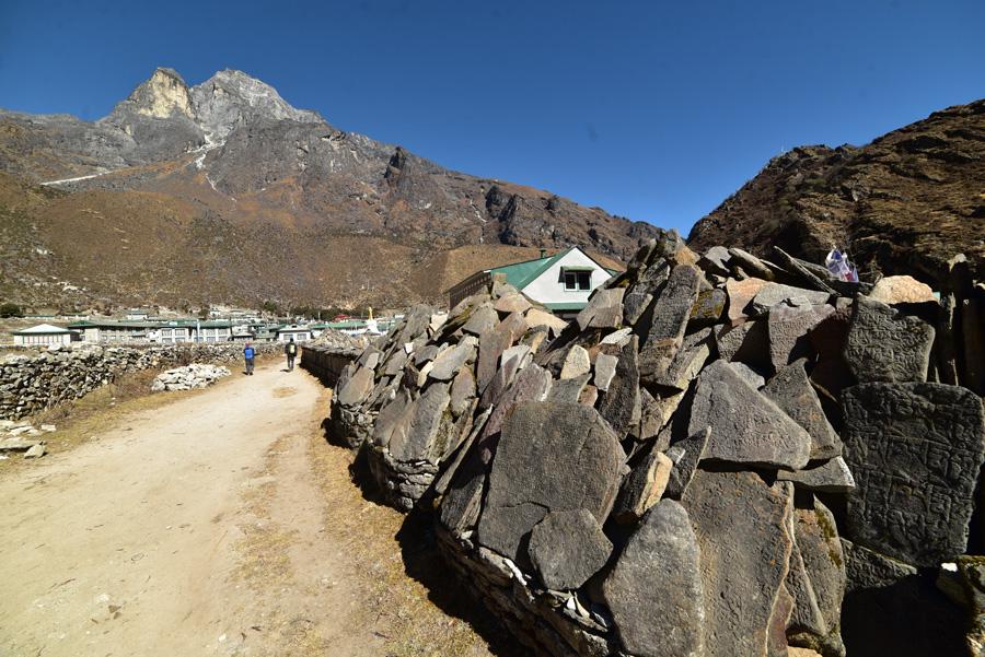 L’arrivée au village de Khumjung se fait en fait en deux temps. On arrive d’abord à la carrière de pierre, depuis laquelle un chemin est matérialisé et longé par un muret de pierre, puis on accède au village proprement dit.
