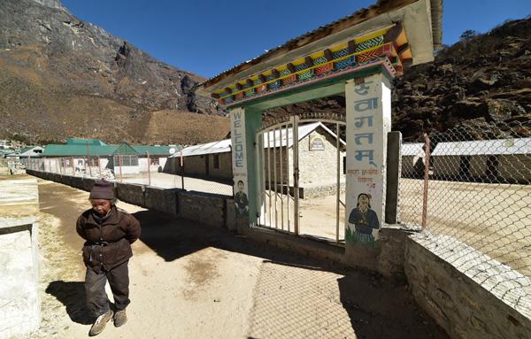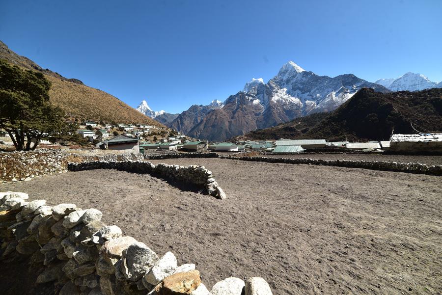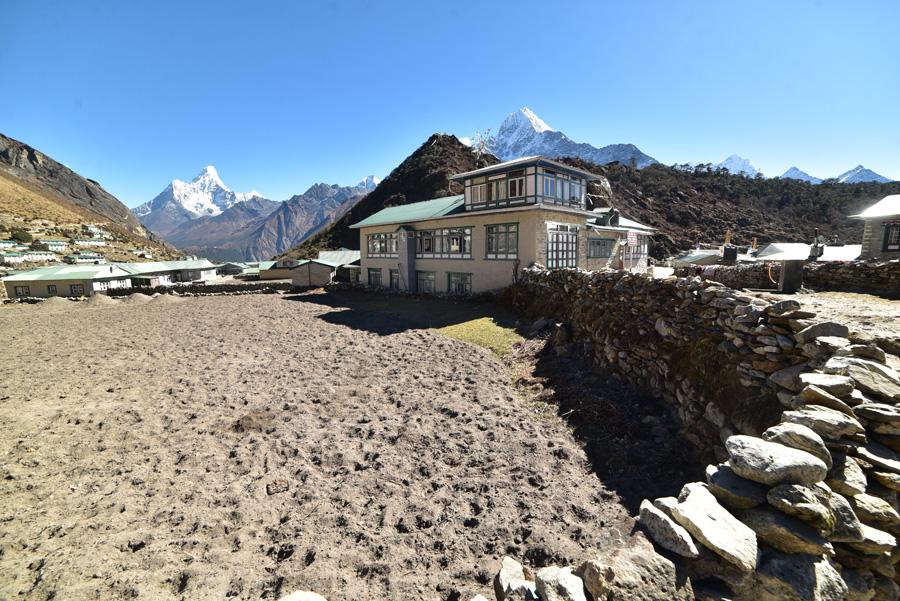 Tout de suite, à droite, à l’entrée du village, un long mur mani avec des chortens et des stupas évoque l’époque où Khumjung était alors la capitale des Sherpas. Elle fut fondée, il y a 500 ans et fut l’une des premières colonies de Khumbu. À droite encore, l’école avec son terrain de football.