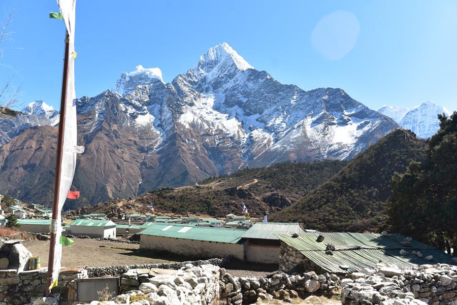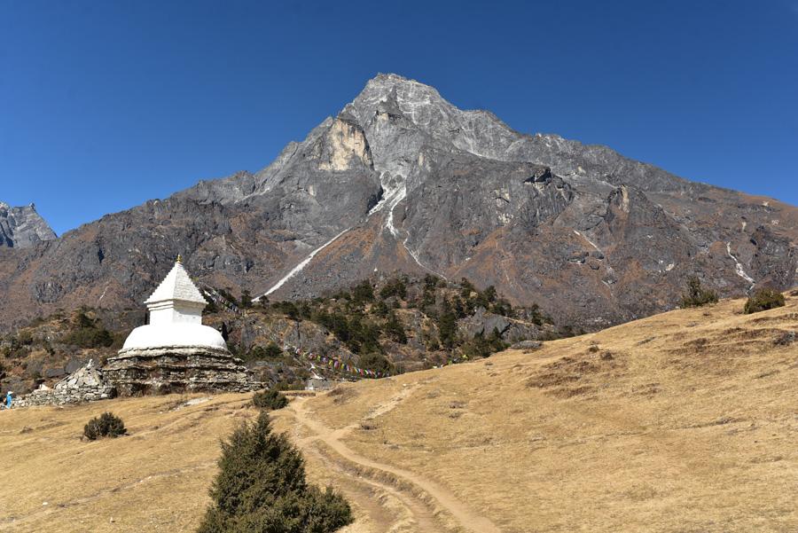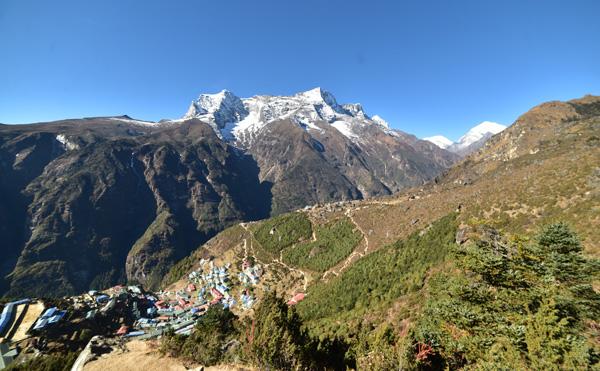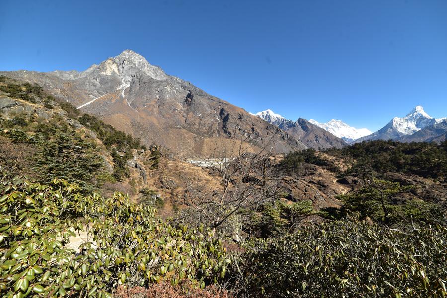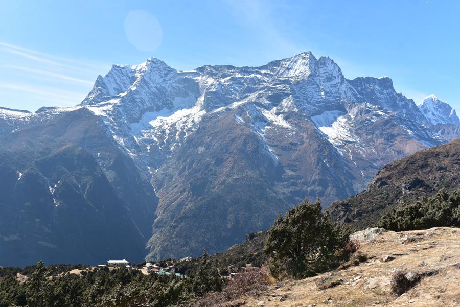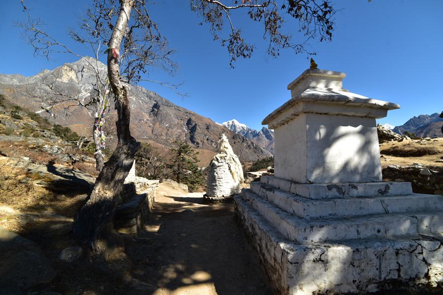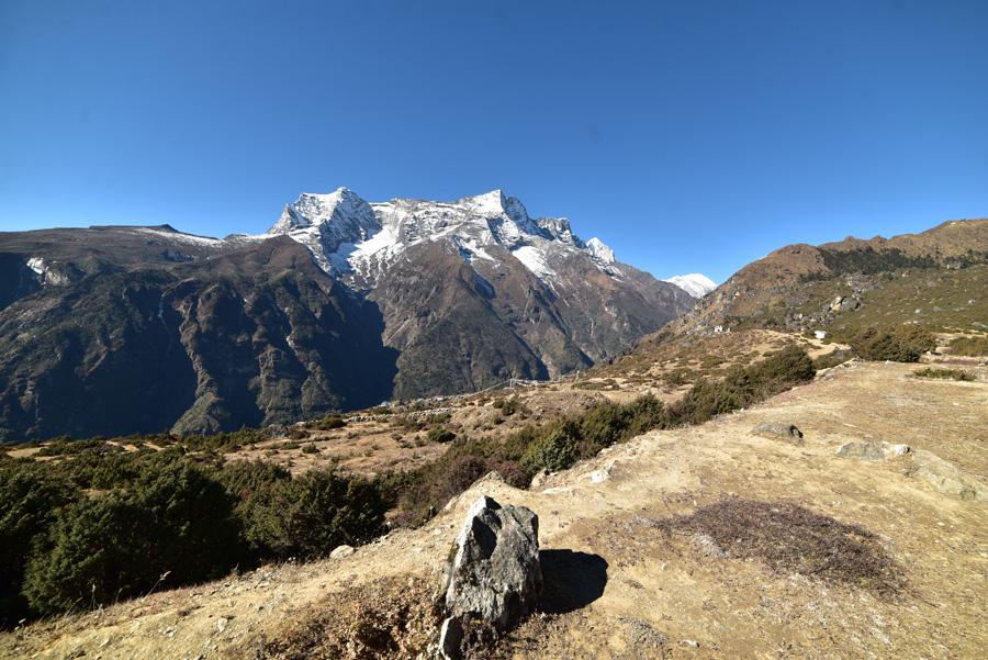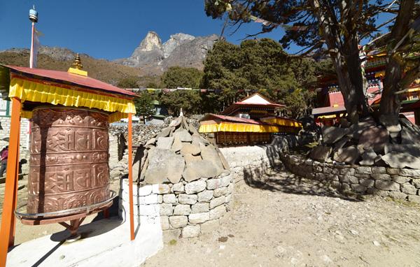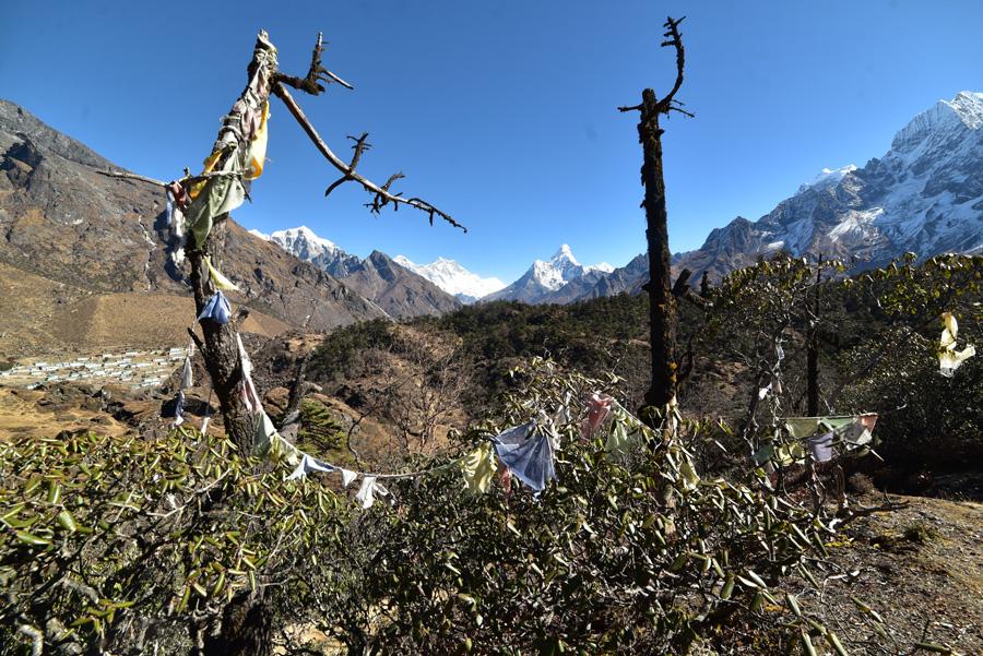 Vers le sud-est se dresse le Thamserku (6.608 m), et au nord-ouest le Kongde Ri (6.187 m). Enfin, tout au nord, on peut voir la montagne sacrée du Khumbu, le Khumbila (5.761 m), résidence de la déesse Tetsan Gelbu. Des drapeaux de prières font ainsi référence à elle.