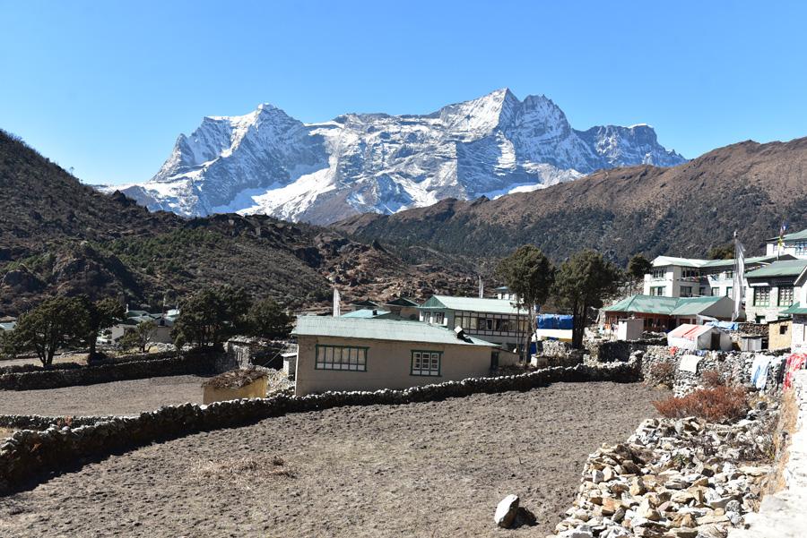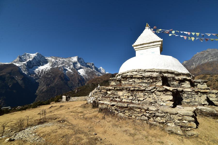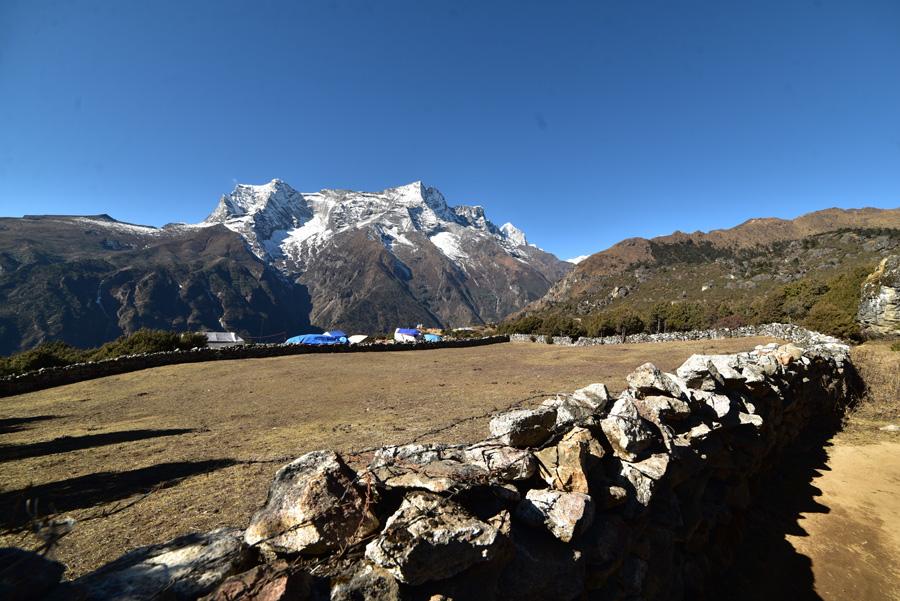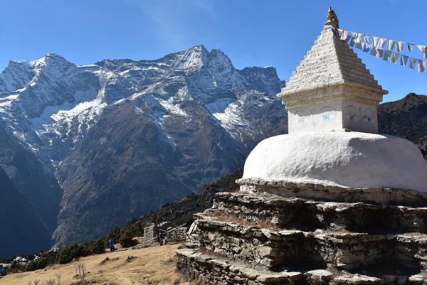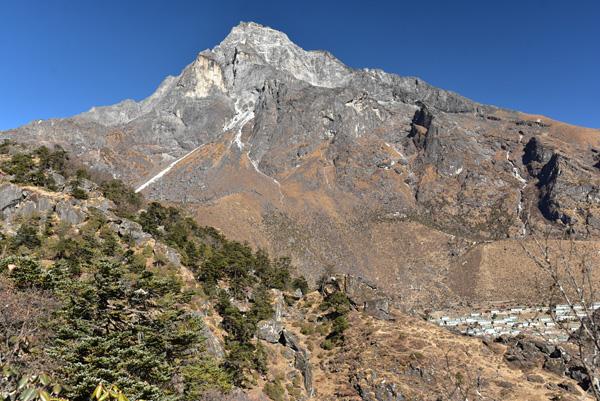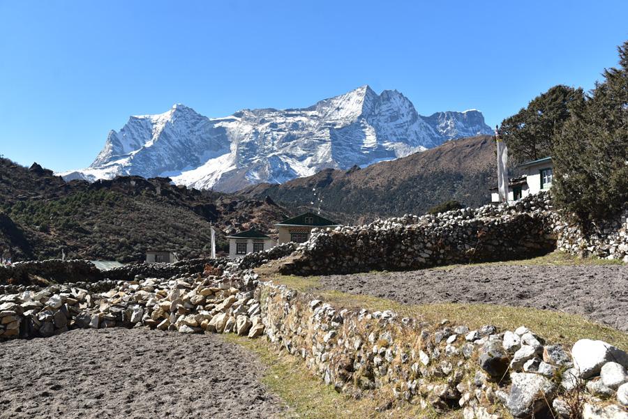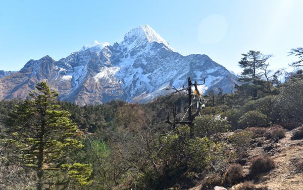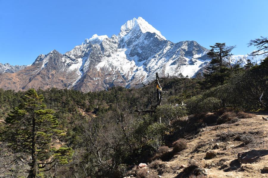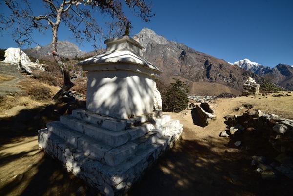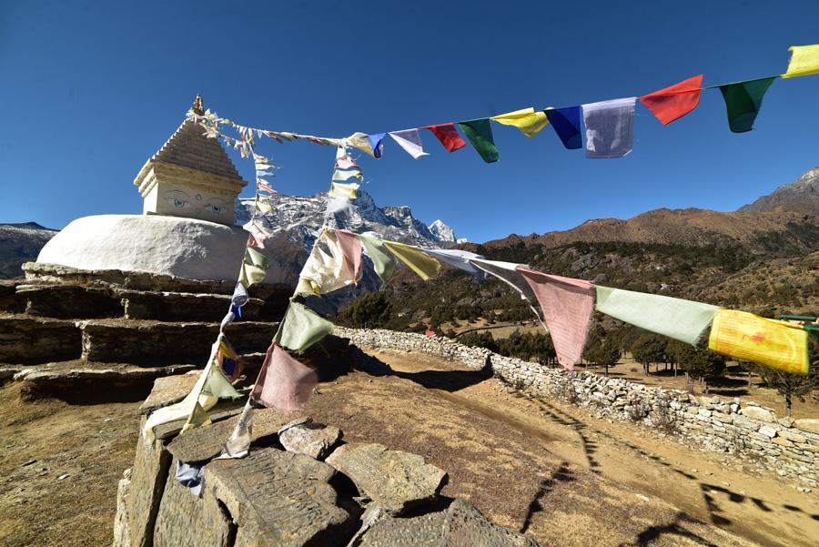 Vers le sud-est se dresse le Thamserku (6.608 m), et au nord-ouest le Kongde Ri (6.187 m). Enfin, tout au nord, on peut voir la montagne sacrée du Khumbu, le Khumbila (5.761 m), résidence de la déesse Tetsan Gelbu. Des drapeaux de prières font ainsi référence à elle.
