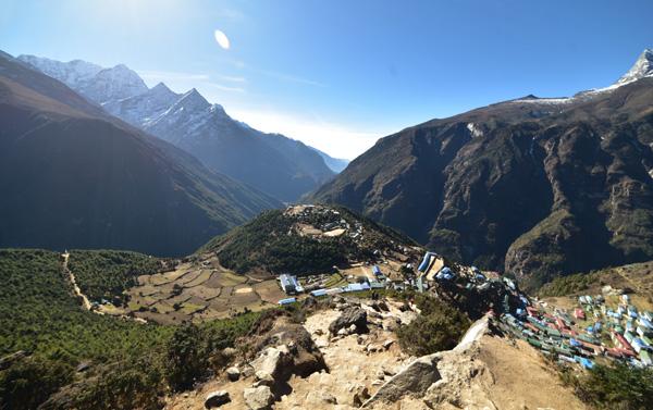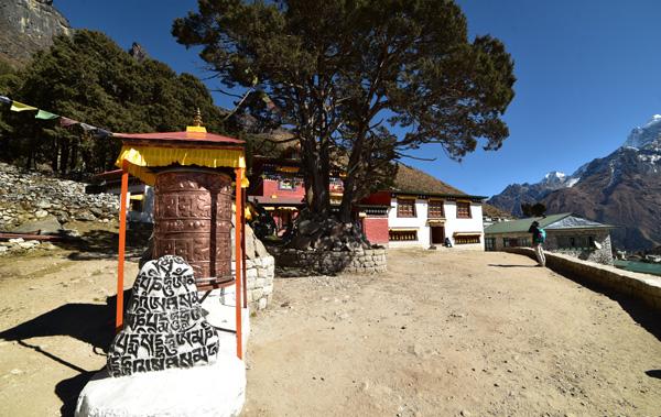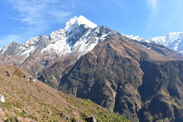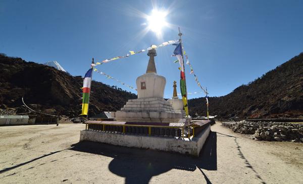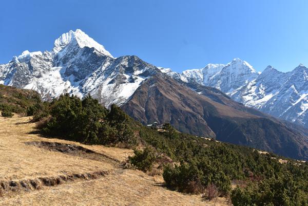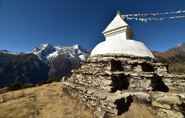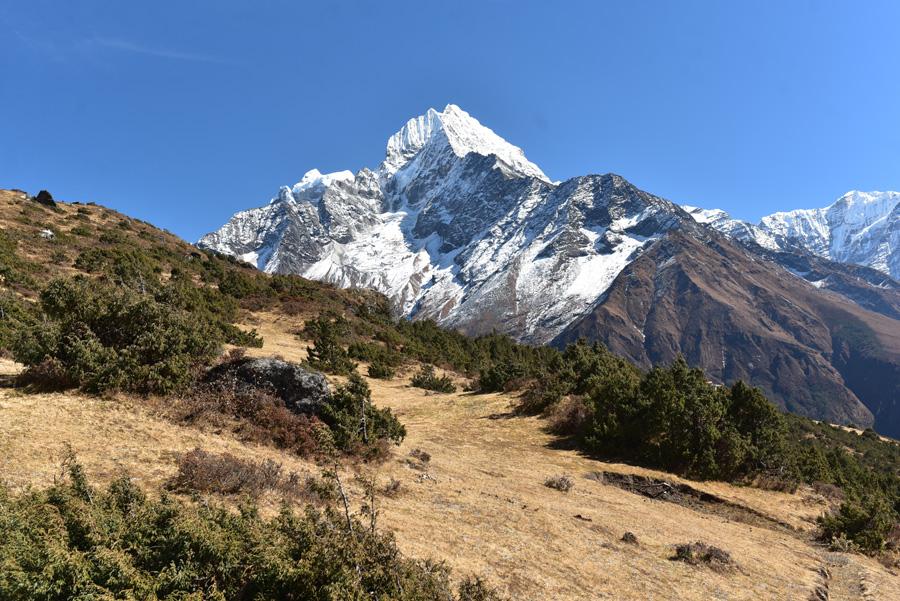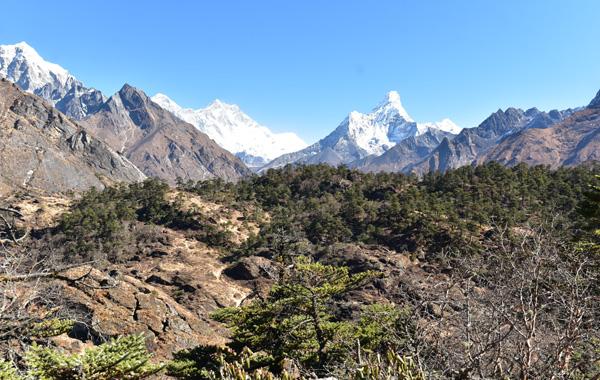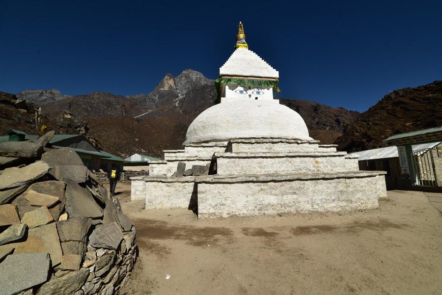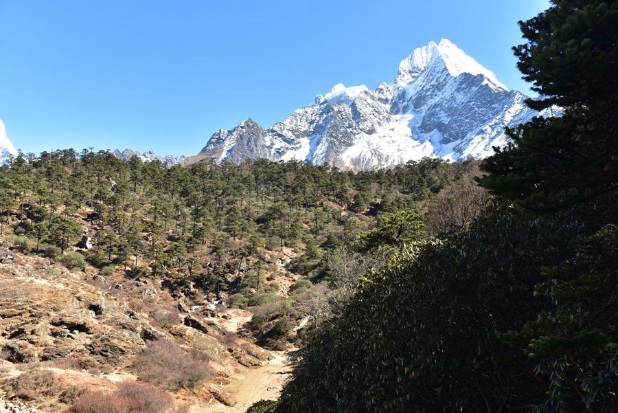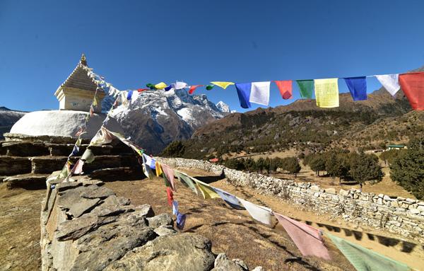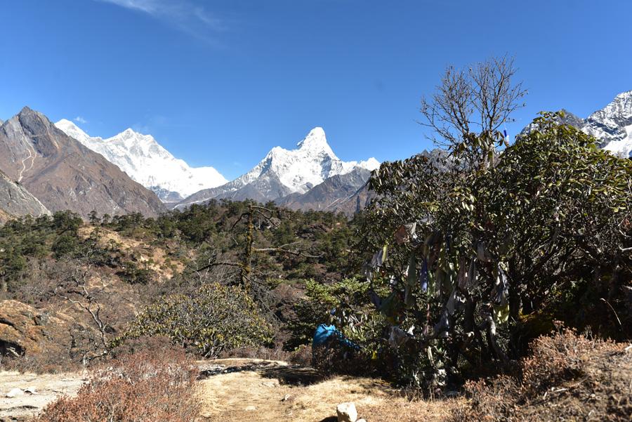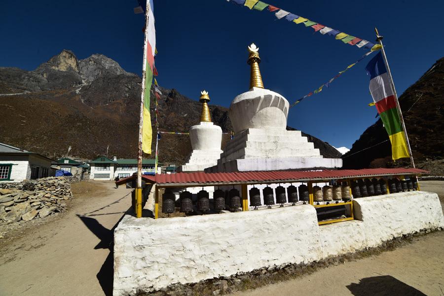 Vers le sud-est se dresse le Thamserku (6.608 m), et au nord-ouest le Kongde Ri (6.187 m). Enfin, tout au nord, on peut voir la montagne sacrée du Khumbu, le Khumbila (5.761 m), résidence de la déesse Tetsan Gelbu. Des drapeaux de prières font ainsi référence à elle.