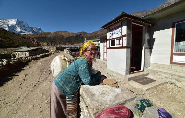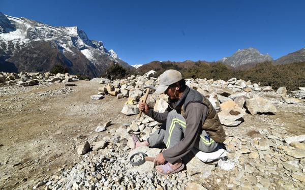 C’est ce dernier que nous prendrons. On emprunte d’abord un sentier plutôt sablonneux, puis de nombreuses marches qui mènent jusqu’au village de Khumjung, qui fut l’ancienne capitale de Sherpas avant Namche Bazar. À l’entrée du village se trouve une petite carrière où quelques ouvriers taillent des pierres pour bâtir des lodges.