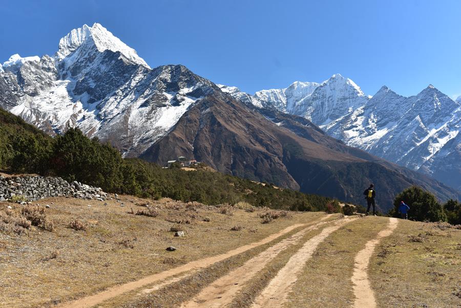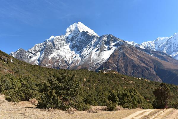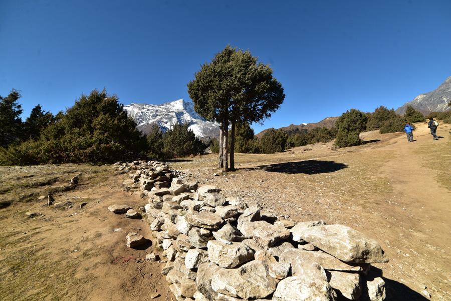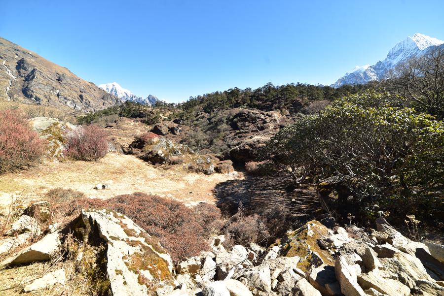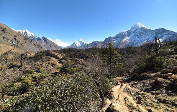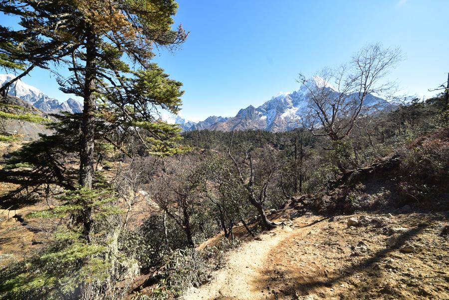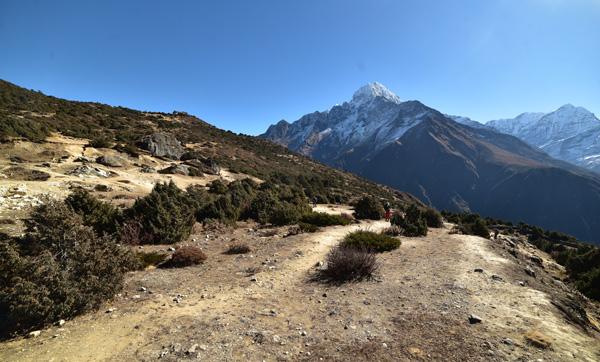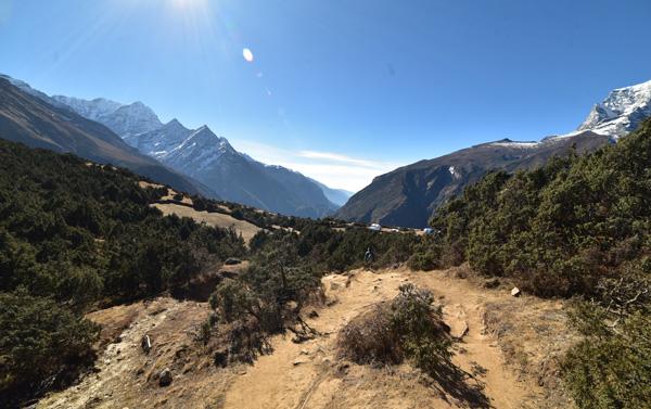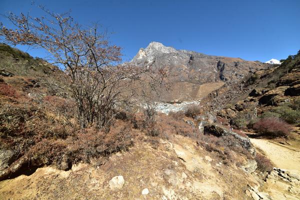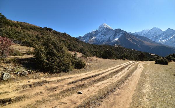 Après quoi, on a juste à suivre de nouveau un chemin sablonneux qui se fraie un passage à travers une rangée d’arbustes. Cette petite descente est vraiment des plus agréables après l’ascension éprouvante du mont Khumjung (3.900 m). Une vraie partie de plaisir.