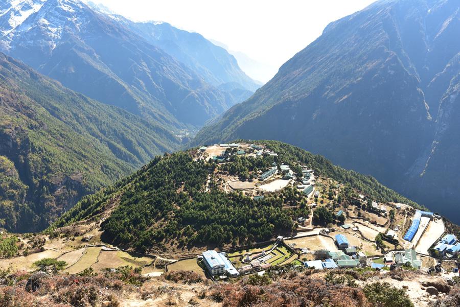 En me retournant, je peux voir le chemin accompli, le minuscule plateau qui abrite les bureaux du parc national de Sagarmatha.