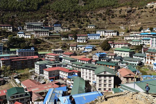 Enfin, après un peu plus d’une heure de marche, Namche Bazar et sa cohorte de lodges et d’habitations de sherpas apparaît au fond de la vallée. Ce sera le moment de faire quelques courses et d’acheter quelques souvenirs… Sans oublier de recharger nos portables et nos batteries d’appareil-photo au café du coin. Gratuit !