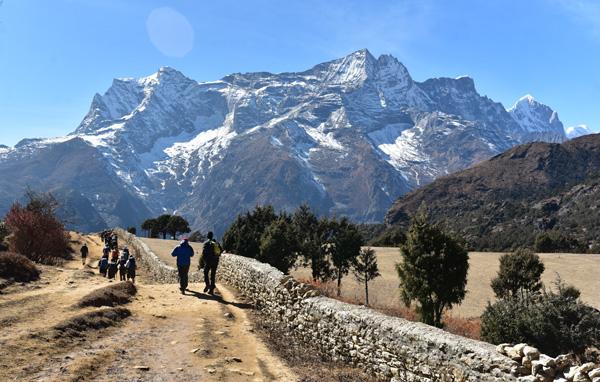 On marche dans les pas du sentier creusé par les sabots des yachs et des chevaux, avec en point de mire la cime blanche d’Ama Dablam.