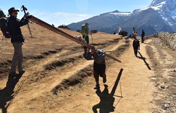 Mais le plus impressionnant encore reste le nombre de sherpas qui remontent le sentier chargés de pierres et de poutres de construction dans le dos.