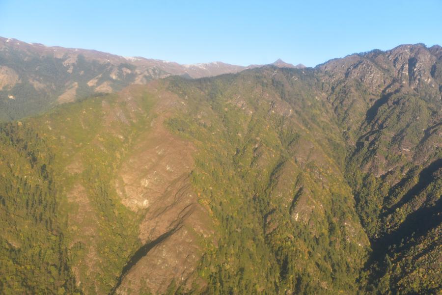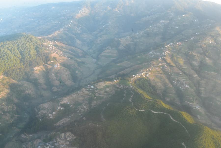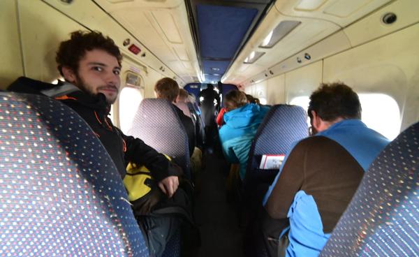 Mais nous ne sommes pas encore au bout de nos peines. Le minibus parcourt encore bien deux kilomètres avant d’atteindre une petite piste secondaire de l’aéroport de Lukla. Un bimoteur de type Dornier 228 attend à côté de la piste. Le temps pour le pilote de faire le tour de l’avion, d’inspecter la carlingue, et nous montons à bord. Une hôtesse de l’air nous offre des bonbons. Service de bord impeccable !