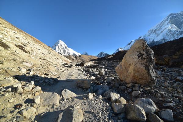 Plus loin, sur la gauche, un sentier plus praticable apparaît. Encore un petit quart d’heure de marche et nous serons arrivés à Gorak Shep.