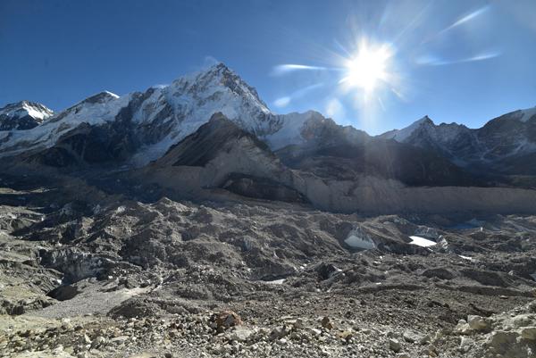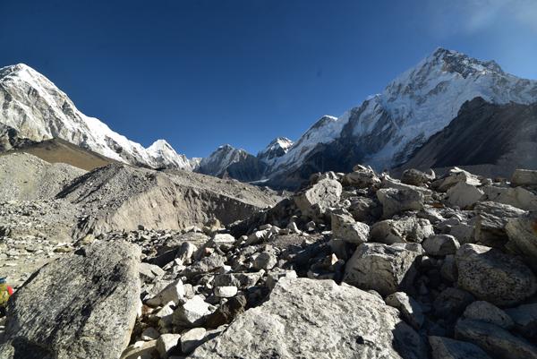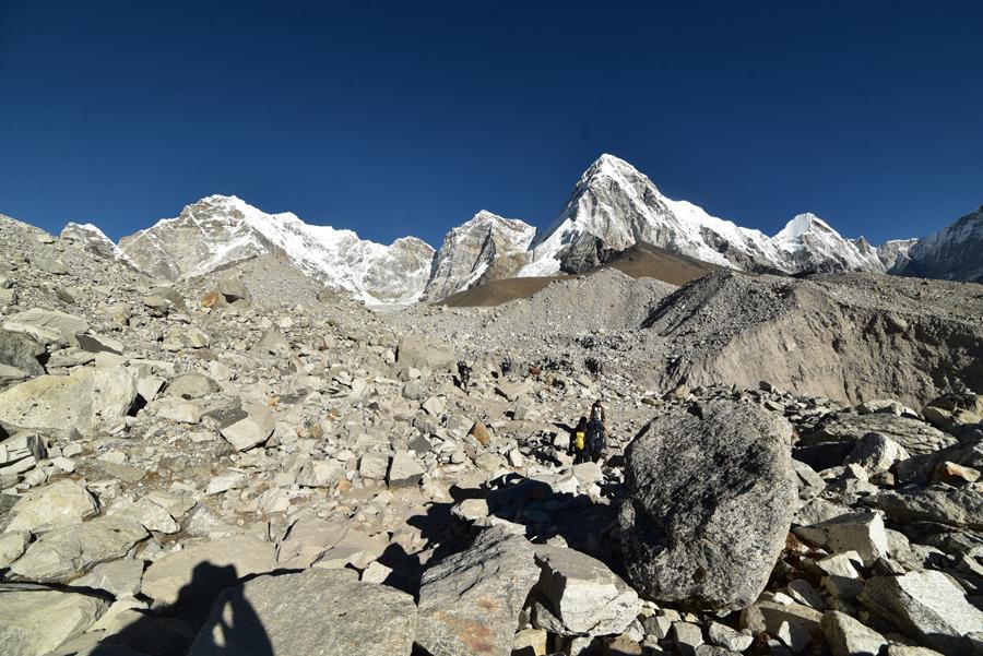 Après environ une heure de marche, le chemin rejoint le glacier du Khumbu, que l’on longe en suivant un sentier balisé par des cairns. La progression devient plus technique, avec des passages rocailleux où il faut parfois enjamber de petites crevasses ou contourner des séracs instables. Le grondement sourd de la glace qui craque et se déplace sous l’effet de la chaleur diurne rappelle constamment que l’on évolue dans un environnement vivant et potentiellement dangereux. Les premiers camps du parcours d’expédition vers l’Everest apparaissent au loin, avec leurs tentes colorées plantées sur la glace, donnant une dimension presque irréelle au paysage.