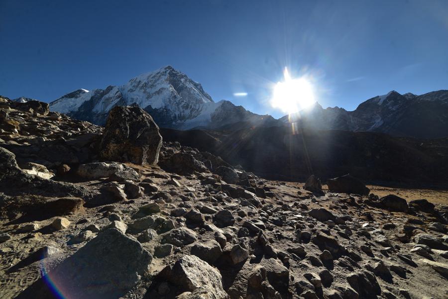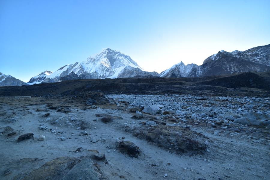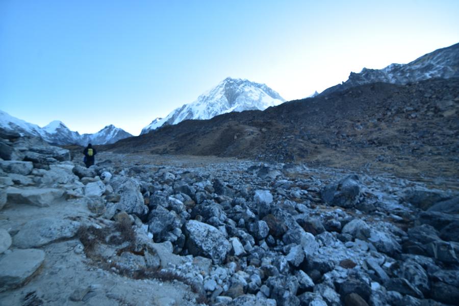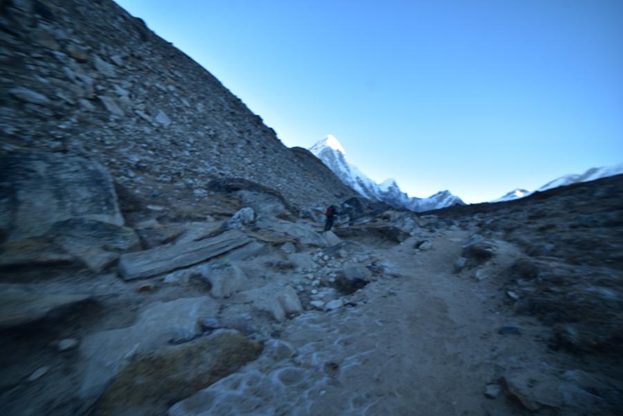 C’est donc au petit matin que nous faisons l’ascension. Départ à 6 heures du matin. Le jour se lève à peine quand nous quittons Lobuche. Nous allons grimper doucement vers Gorak Shep, l’avant-dernier poste de civilisation avant le camp de base de l’Everest. Sans doute le village le plus haut du globe : 5.170 mètres d’altitude. Du coup, on longe la montagne et on s’engage dans un large défilé encadré par la moraine latérale du Khumbu. Devant nous se dresse le pic enneigé du Lhotse, et en arrière-plan, l’Everest.