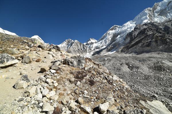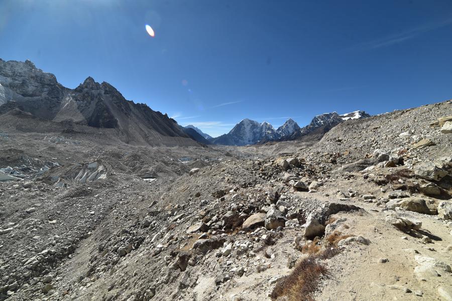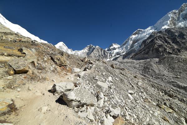 Je rembobine le fil de la montée. Retour vers midi quand on commence l’ascension. Un chemin sablonneux mène jusqu’au glacier Khumbu. Le chemin n’est pas vraiment difficile, jonché par les débris de roches rejetés par le monstre de glace, mais rien de véritablement compliqué.