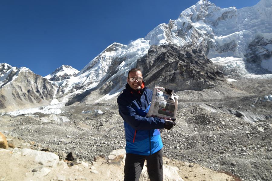 Mais pas question de quitter le camp de base sans déployer la une de mon journal. Une promesse que je me suis faite, une promesse que j’ai faite à mon boss avant de partir : déployer la une de L’Éclaireur au pied de l’Everest. Maintenant que c’est fait, je m’aperçois combien j’étais présomptueux de croire que je pourrai un jour ouvrir les pages du journal au pied du toit du monde. Monter ici demande tellement d’effort quand on n’est pas une bête sportive. Tellement de volonté. Plus encore quand on approche la cinquantaine. Mais je l’ai fait.