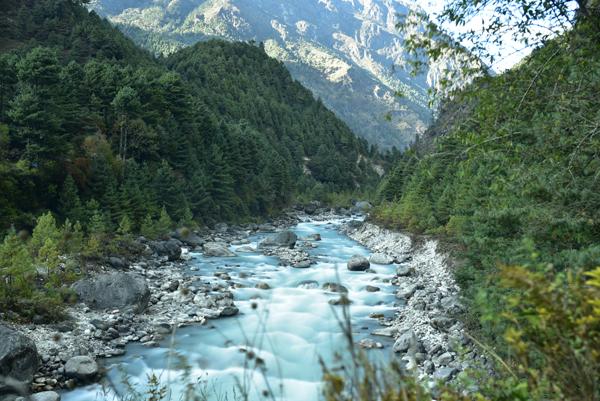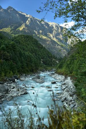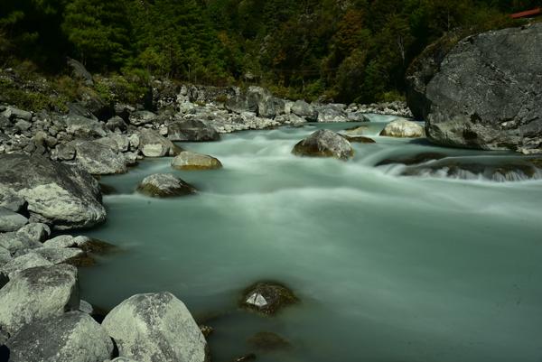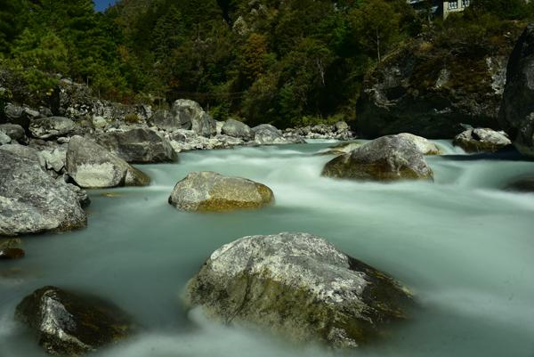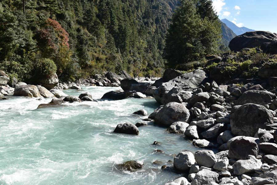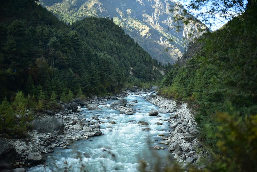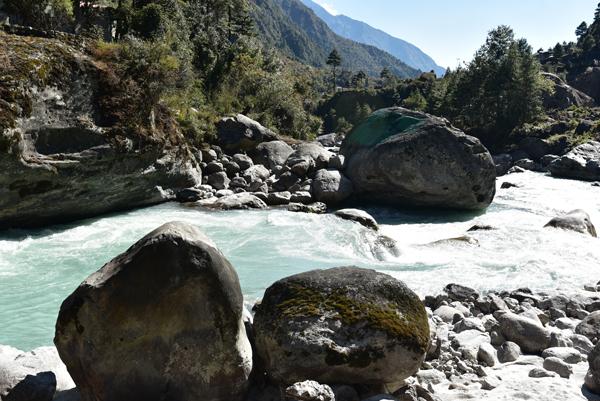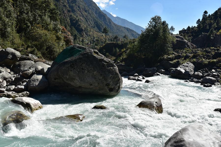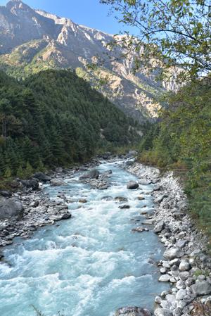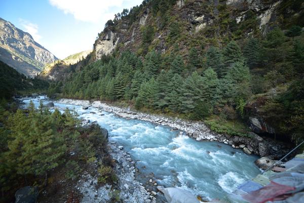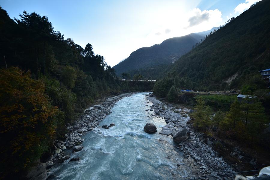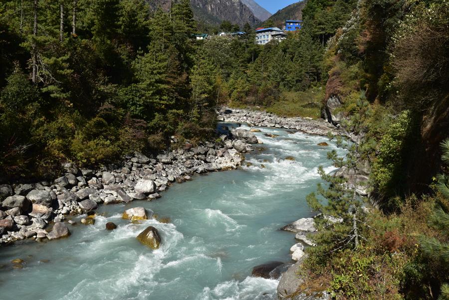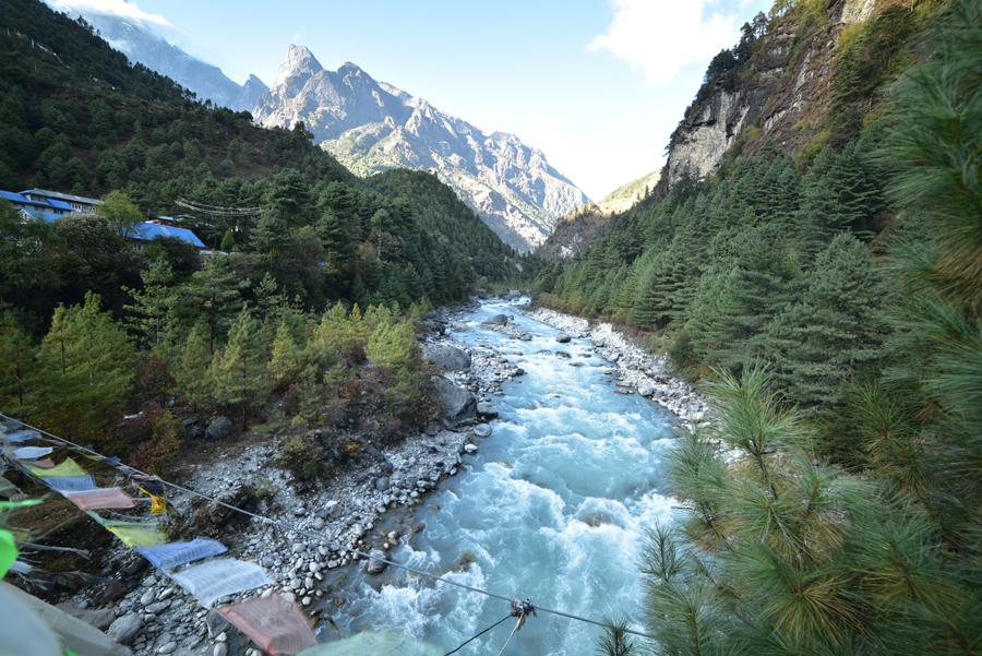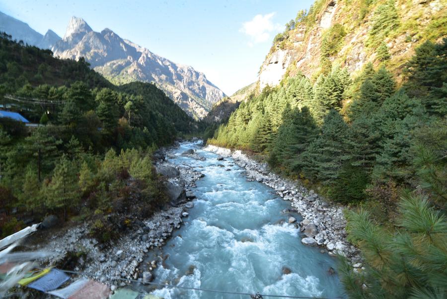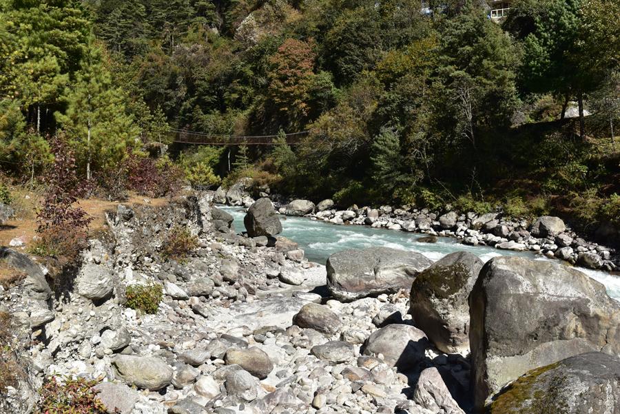 Enfin arrivés à Phakding. Il est encore tôt dans l’après-midi et avec Pierre, on décide d’aller faire un petit tour autour du village. Cela tombe très bien, Phakding est construit autour de Dudh Kosi, la fameuse « rivière de lait ». Pour aller la voir, on a juste à rebrousser chemin sur une centaine de mètres et traverser un pont suspendu depuis lequel on peut admirer la rivière dévaler les pentes de l’Himalaya, chargée des sédiments des plus hautes cimes du monde.