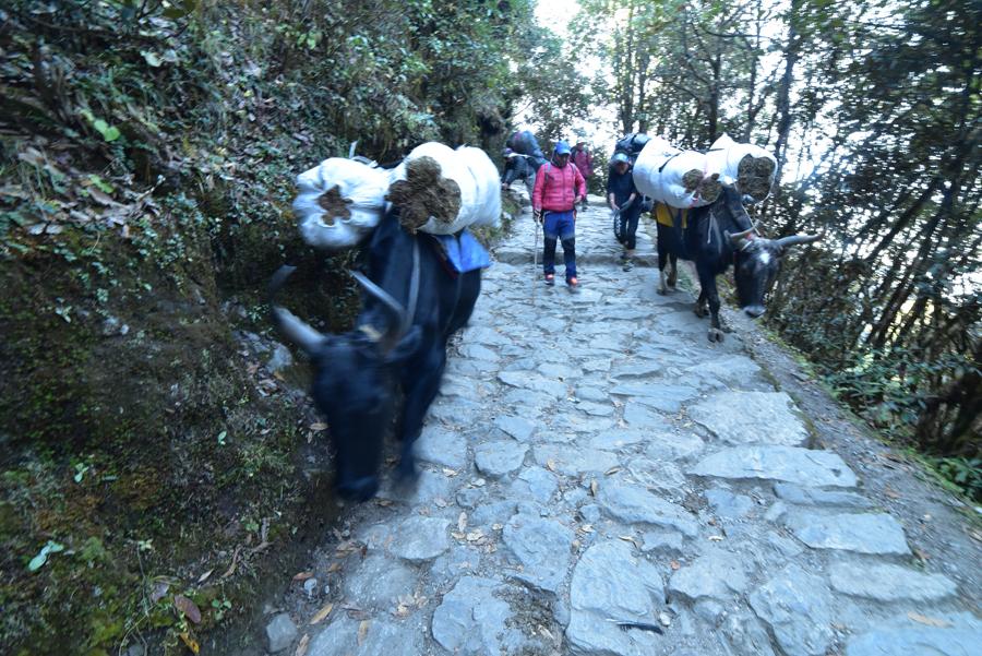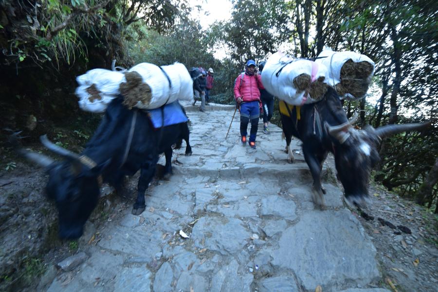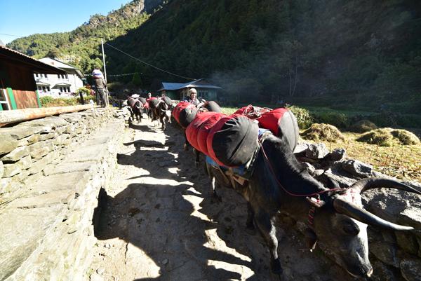Plus loin sur le chemin, nous croisons également nos premiers convois d’ânes et de chevaux. Il n’existe pas de route pour monter cette partie de l’Himalaya. Le seul moyen de ravitailler les lodges et les refuges est de charger les animaux de la besogne.