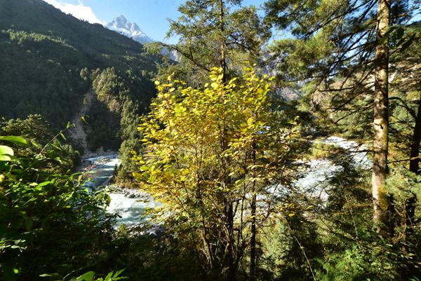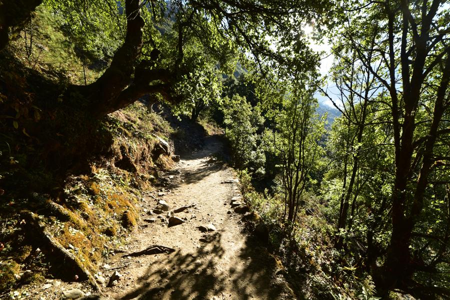 Une marche de 2 h 30 nous attend avec sur notre gauche les plus grands sommets de l’Himalaya qui surgissent au-dessus de la forêt.