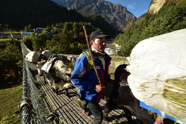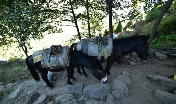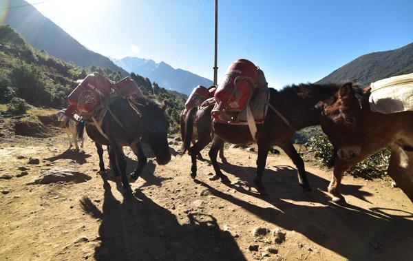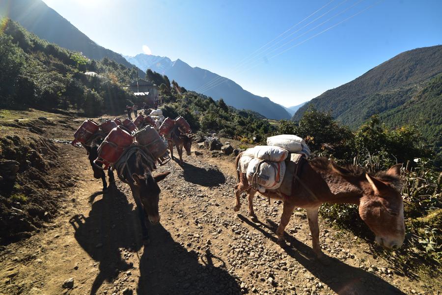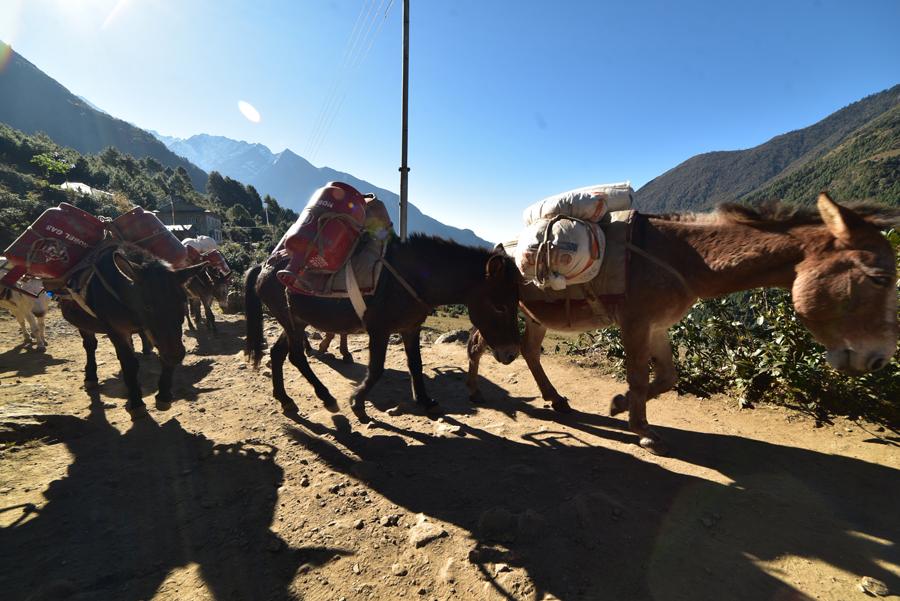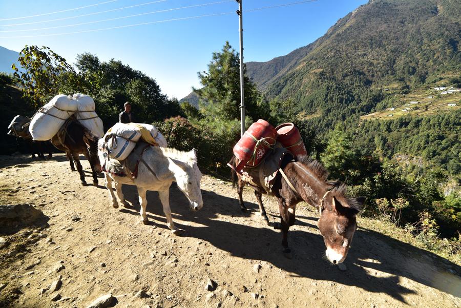 Bouteilles de gaz, provisions, eau, riz… Toutes les marchandises sont acheminées sur le dos des ânes et des chevaux. À leur passage, il vaut mieux s’écarter du côté de la paroi rocheuse si on ne veut pas faire le grand saut dans le vide.